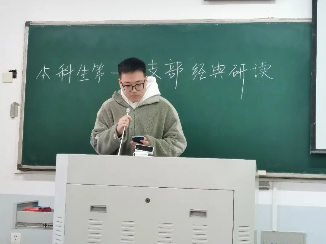 本次经典研读以《毛泽东选集》的创作、传播和应用为主线。学生党员陈雨萌首先向全体党员分享了相关著作选段,并向与会党员展示自身心得体会,加深与会党员对《毛泽东选集》原著的认识、理解,在字里行间领悟信仰的力量。