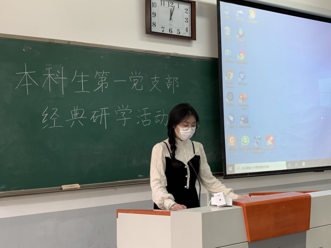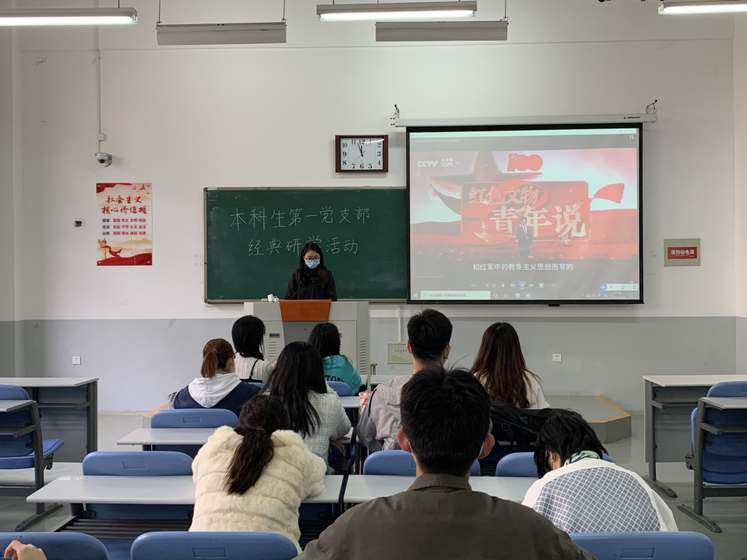 学生党员谢美宁首先向全体党员详细地介绍了《反对本本主义》一文的写作背景、主要内容和《反对本本主义》所强调的调查方法和调查研究所具有的重要地位。并和与会党员一同回顾了20世纪二三十年代我党的经历,播放相关视频展示了老一代共产党人对党的拥护和支持,让与会党员对《反对本本主义》著作相关内容了解得更加深入,在字里行间领悟信仰的力量。