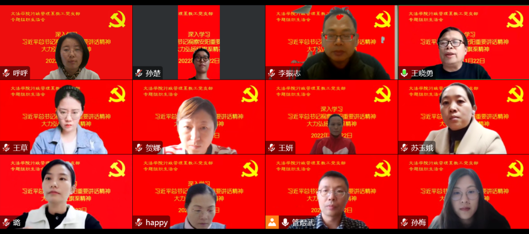 行政管理系教工党支部召开“深入学习习近平总书记视察安阳重要讲话精神,大力弘扬红旗渠精神”专题组织生活会,会议采取线上形式举行。支部全体党员参加,院长王晓勇以普通党员身份参与,会议由支部书记管煜武主持。