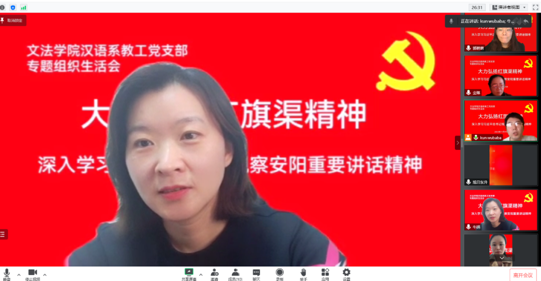 汉语系教工党支部通过网络平台腾讯会议召开“深入学习习近平总书记视察安阳重要讲话精神,大力弘扬红旗渠精神”专题组织生活会。会议由汉语言文学系教工党支部书记刘华主持,太阳城App