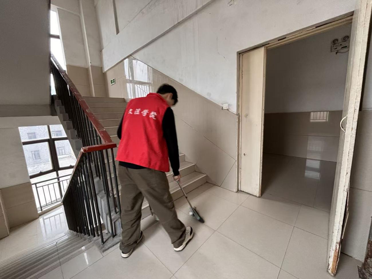 活动中,学生党员明确任务分工,划定责任区域,在了解活动纪律与安全注意事项后,他们手持扫帚、拖把、垃圾袋等工具,有序开展垃圾捡拾、落叶清扫等工作,重点对宿舍楼楼道、洗漱间、窗台等进行全面清理。学生党员们分工协作,不仅改善了宿舍楼卫生环境,还以实际行动诠释党员的责任与担当,充分发挥了党员的先锋模范作用。大家纷纷表示,此次主题党日活动意义深刻,未来将把劳动精神融入日常学习和工作,在服务同学、奉献集体中彰显党员价值。