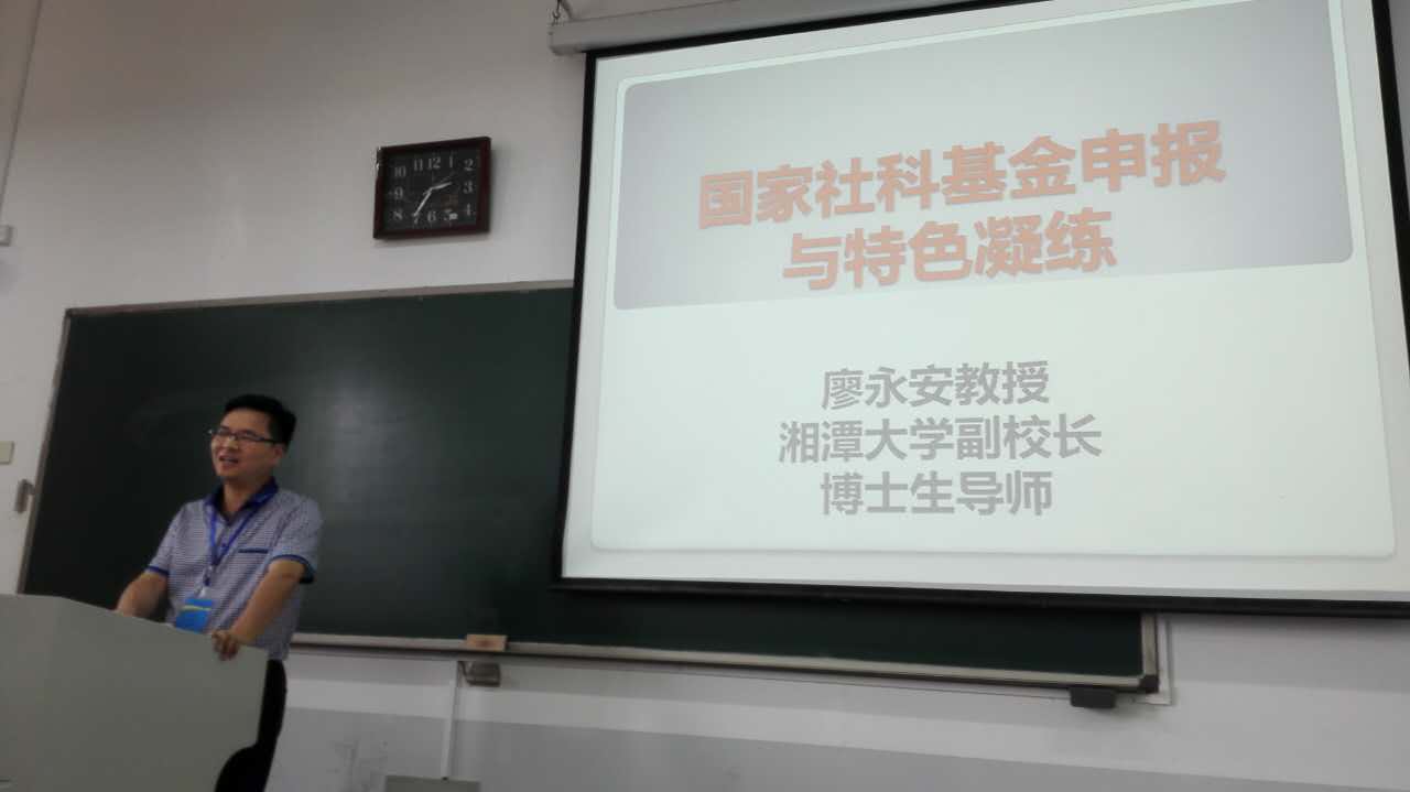 6月24日,国家社科基金评审专家、湘潭大学副校长、博士生导师廖永安教授,应邀在龙子湖校区教学楼E201作了题为“国家社科基金申报与特色凝练”的专题报告。太阳城App 党委书记李培玉主持报告会。