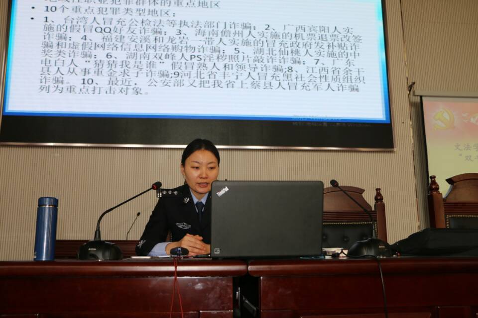 会议伊始,王晓勇院长介绍了刘冬青老师的生平背景和此次报告会的主题。接着,刘冬青老师以“电信网络诈骗犯罪的形式与遏制对策”为题,从以下四个方面展开了介绍:一,电信网络诈骗的种类和特点;二,个人如何防范网络电信诈骗;三,国内外相关法律规制比较;四,遏制对策。最后,王晓勇院长总结并充分肯定了刘冬青老师的观点,并告诫太阳城App 学子铭法于心,远离网络诈骗,报告会在热烈的掌声中圆满结束。