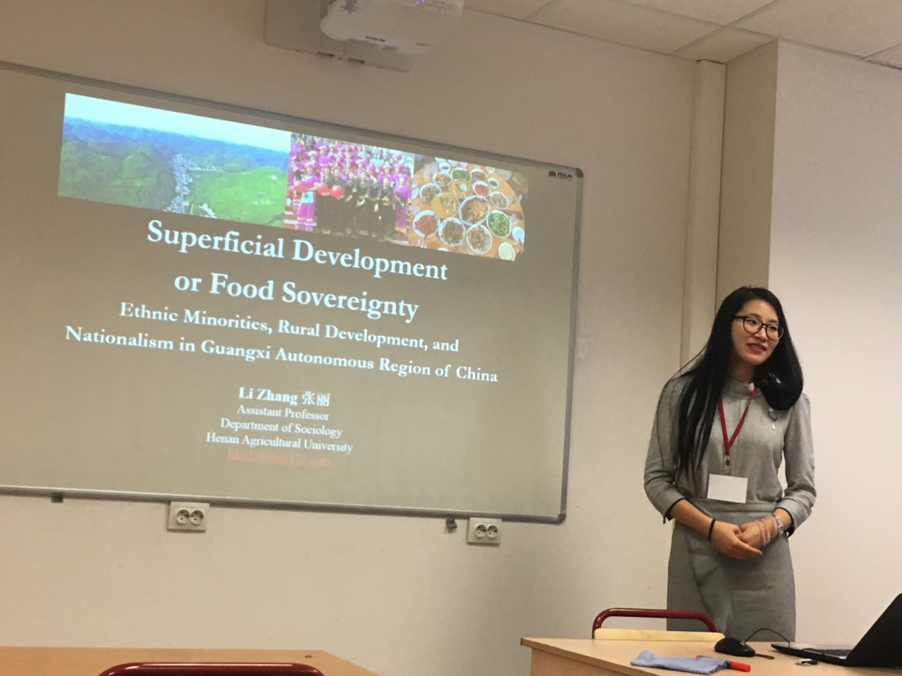 张丽老师在大会的“少数民族、食物主权和生态农业”专题小组会议和讨论中,做了题为:“Superficial Development or Food Sovereignty: Ethnic Minorities, Rural Development, and Nationalism in Guangxi Autonomous Region of China(浅层的发展与食物主权:中国广西少数民族的民族主义与乡村发展)”的发言。