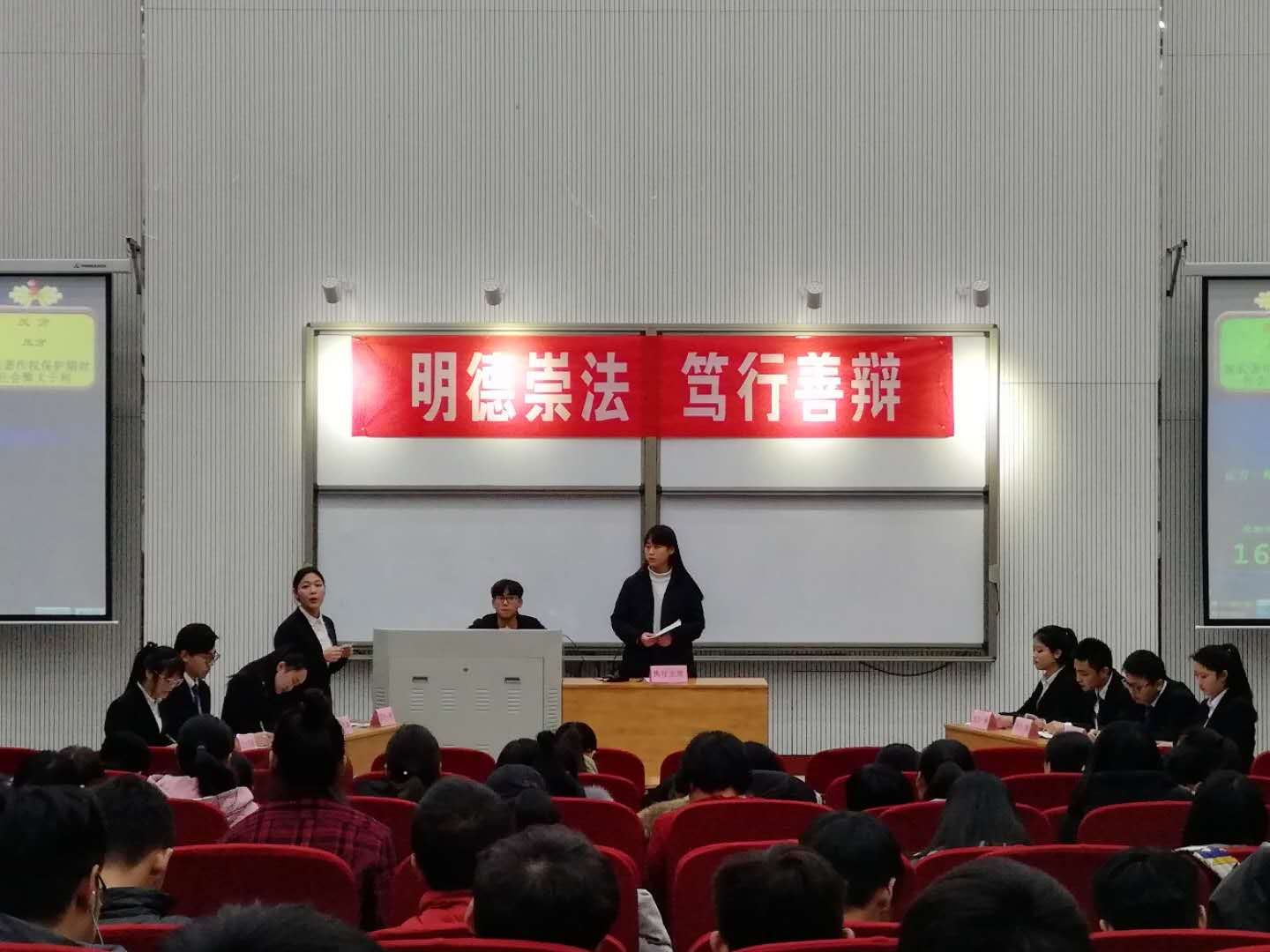 比赛中,双方辩友围绕著作权保护是否该延长问题进行激烈讨论。双方辩友分别就社会主义核心价值观、国家软实力、十九大与生活方面对这个问题进行阐述并深入剖析,以别样的视角看待并呈现当代法与权利冲突问题。