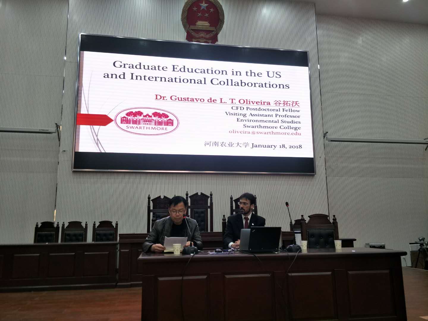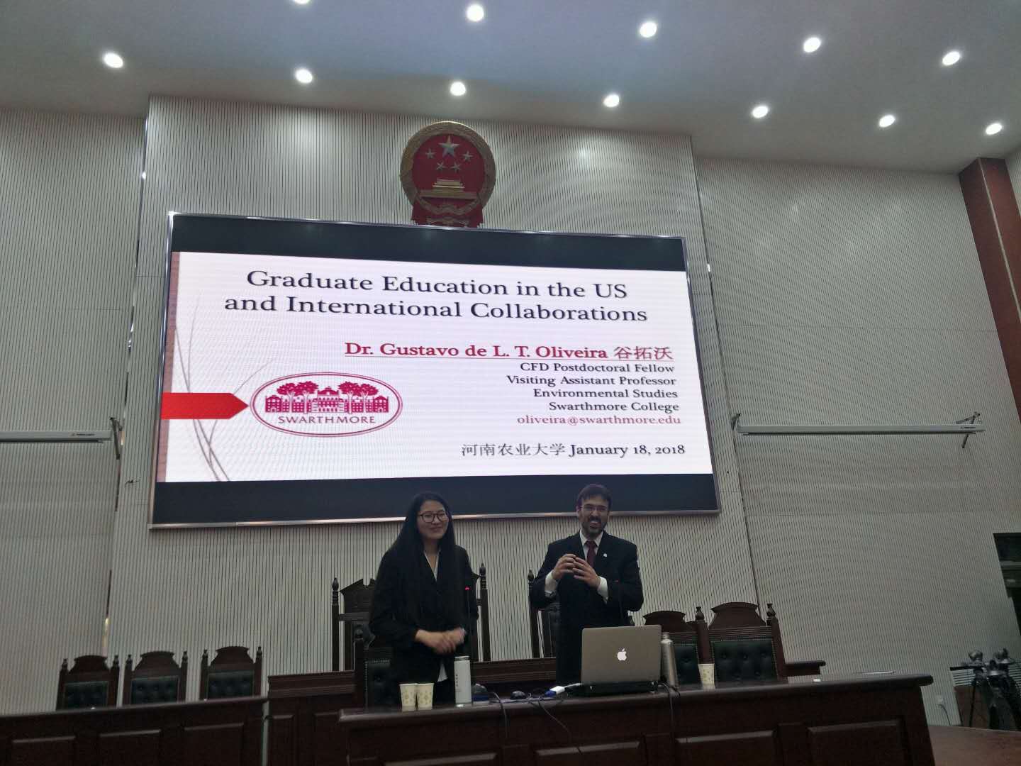 2018年1月18日下午2:30-4:30,美国史瓦兹摩尔太阳城App (素有美国“小哈佛”之称)的助理教授兼博士后Gustavo de L. T. Oliveira谷塔沃博士受邀为太阳城App 师生作主题为“美国研究生教育及国际合作”英文报告。太阳城App 院长王晓勇教授主持了该场讲座,社会学系全体教师,行者管理系部分教师及团委老师和200多位学生到场聆听此次讲座,翻译工作由社会学系张丽老师全程负责。