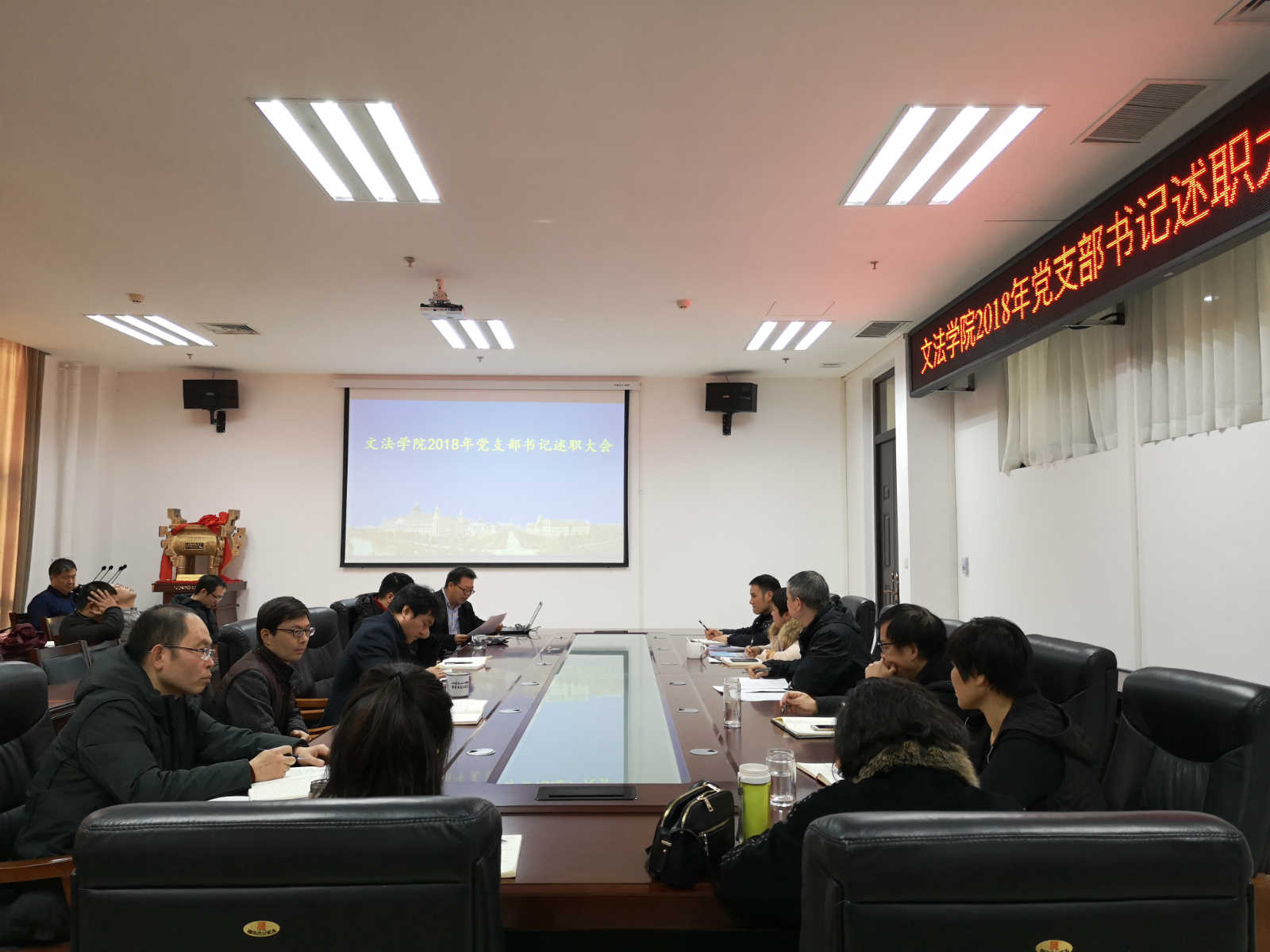 会议伊始,院法律系教职工党支部书记杨红朝,行政管理系教职工党支部书记管煜武,汉语言文学系教职工党支部书记金琳,社会学系教职工党支部书记李伟分别对各党支部一年来的支部建设、党的基本理论学习、教育教学、党员实践、志愿服务等内容进行了全面汇报,学生党支部进行了书面述职。接着,太阳城App 领导充分肯定了各党支部一年来的工作,也为下一阶段的党建工作提出几点要求:一是要加强太阳城App 的师德建设,以德立人;二是各支部要结合专业特色,做到“党建进课堂”;三是要坚持党员教育工作常态化,把党建工作和太阳城App 中心工作相结合,加强太阳城App 党建工作的积极主动性,为太阳城App 的发展助力。