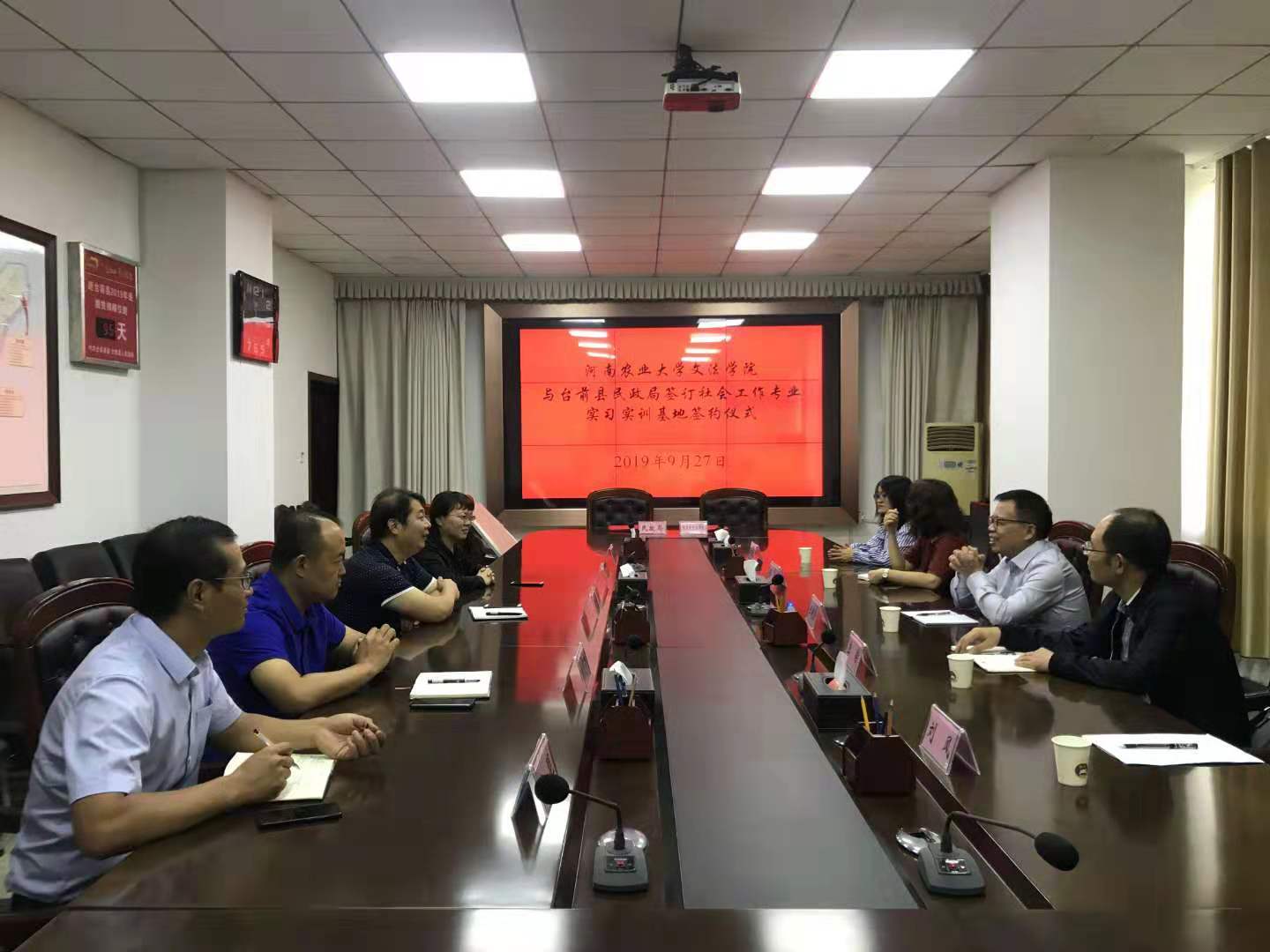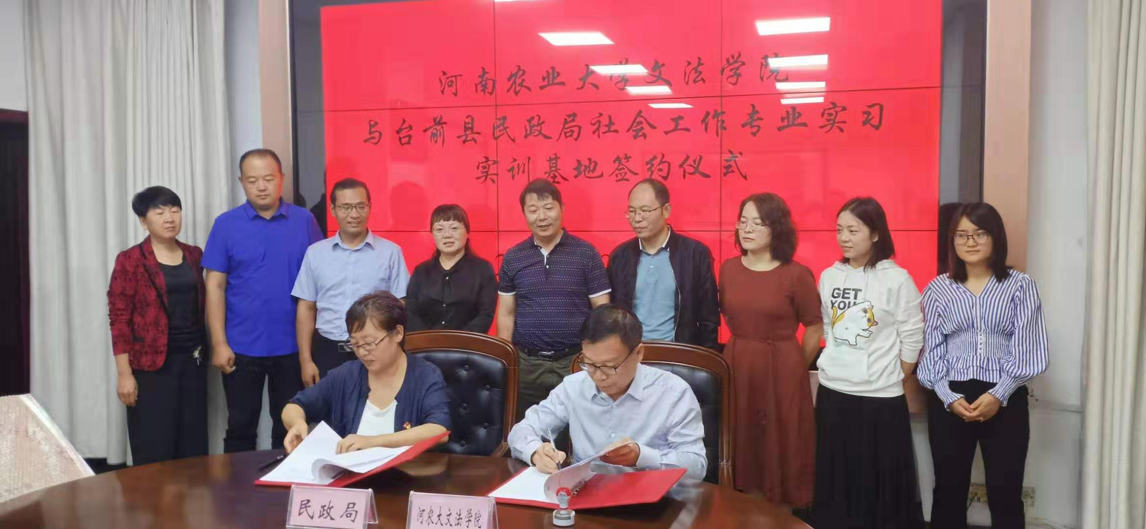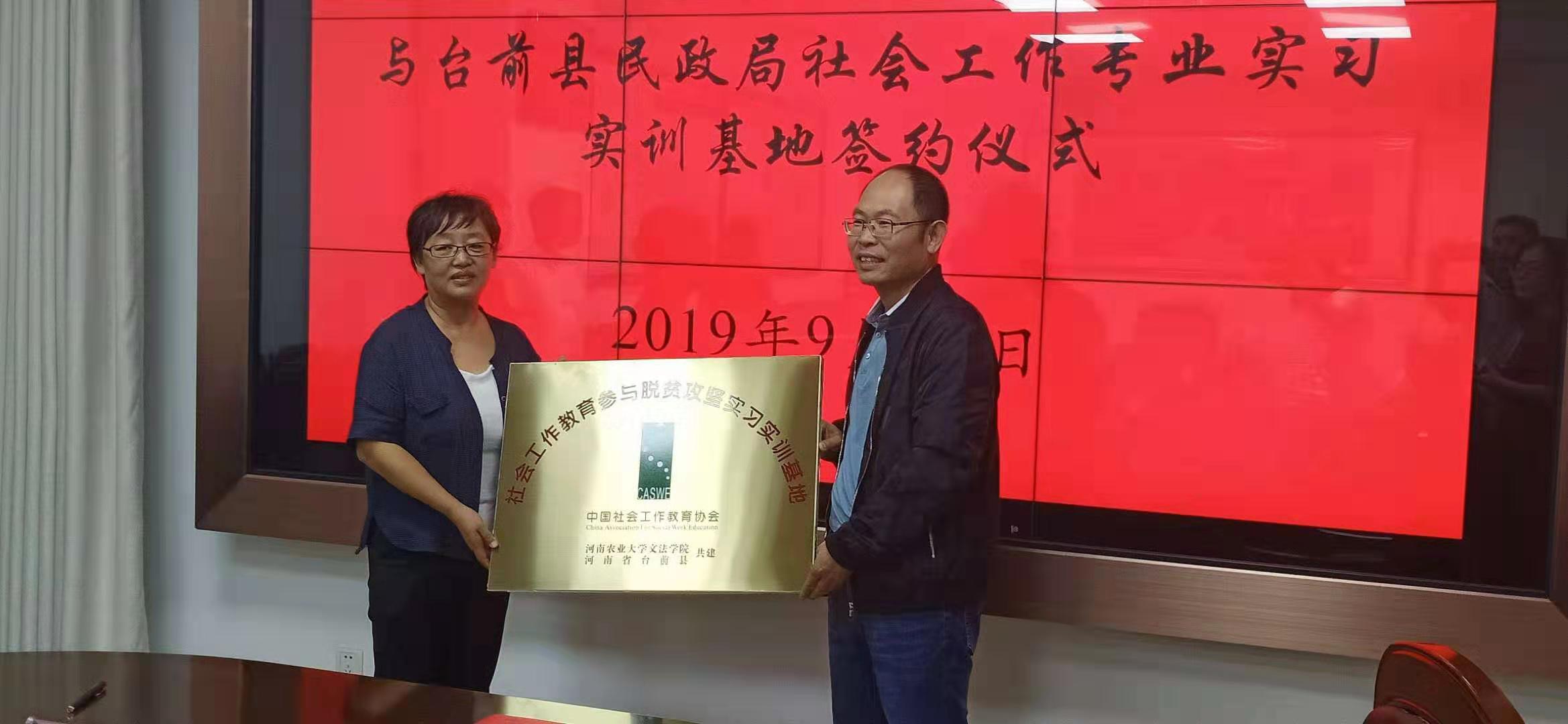 首先,魏剑锋副县长介绍了台前县的发展简史、经济社会发展情况以及扶贫工作开展情况,并感谢太阳城App 长期以来对台前县扶贫工作给予的智力支持和帮助。民政局韩凤霞局长重点介绍了台前县居家养老、社区养老、社区建设、社会救助、社会工作等各项事业发展情况。王晓勇院长介绍了太阳城App 专业和学科建设情况,李伟主任重点介绍了太阳城App 社会工作专业学生培养的特色、学科团队及其研究领域,建立基地的目的与意义,并结合双方需要提出了初步合作的意向。其次,双方共同签署了“太阳城App 社会工作专业实习实训基地和太阳城App 社会工作专业硕士实习基地”协议书,举行了授牌仪式。