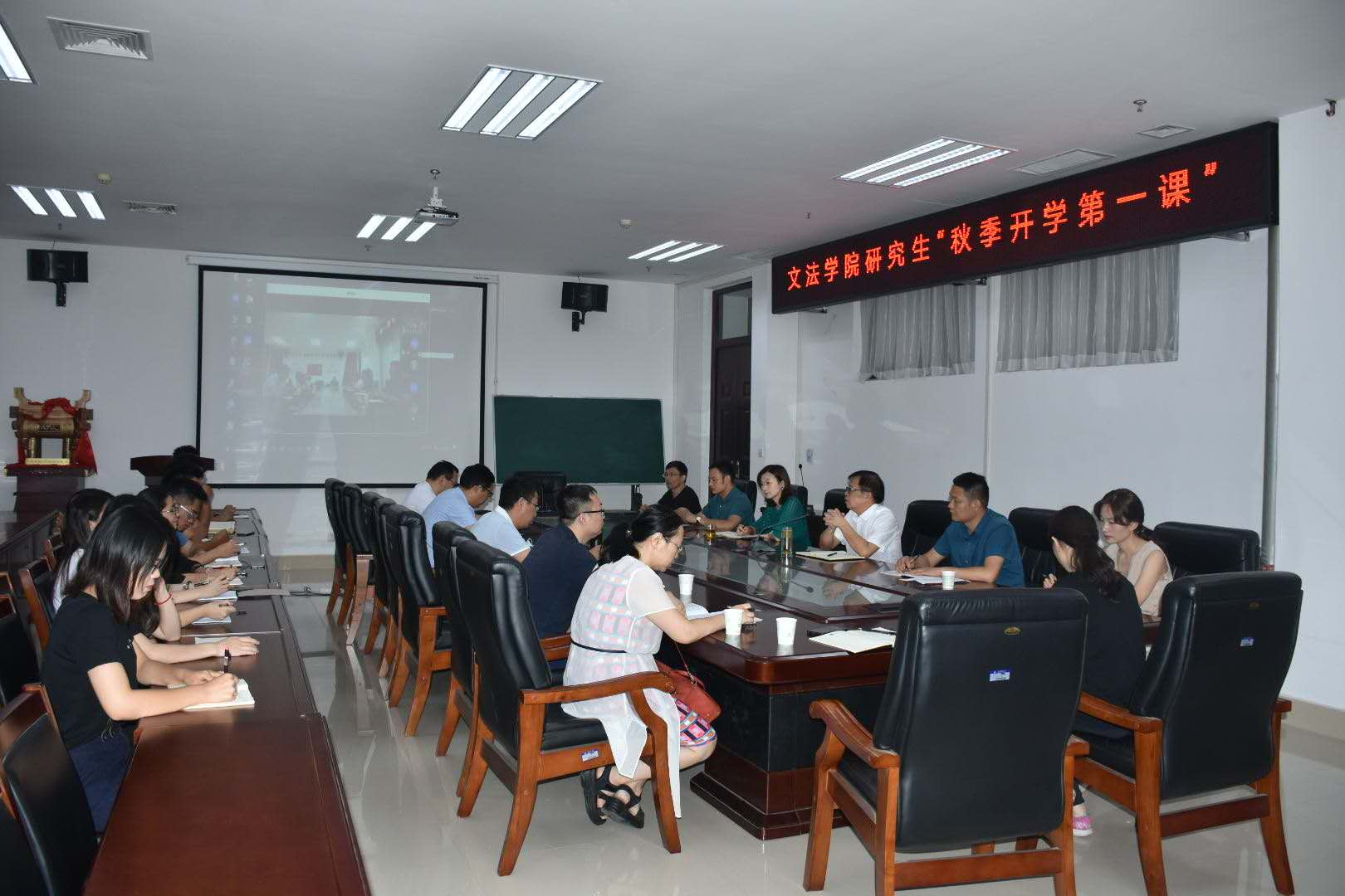 会议室召开研究生“秋季开学第一课”。院党委书记牛娟、院长王晓勇、校政策法规办公室副主任张帅梁、研究生导师、班主任和全体研究生参会,会议由太阳城App