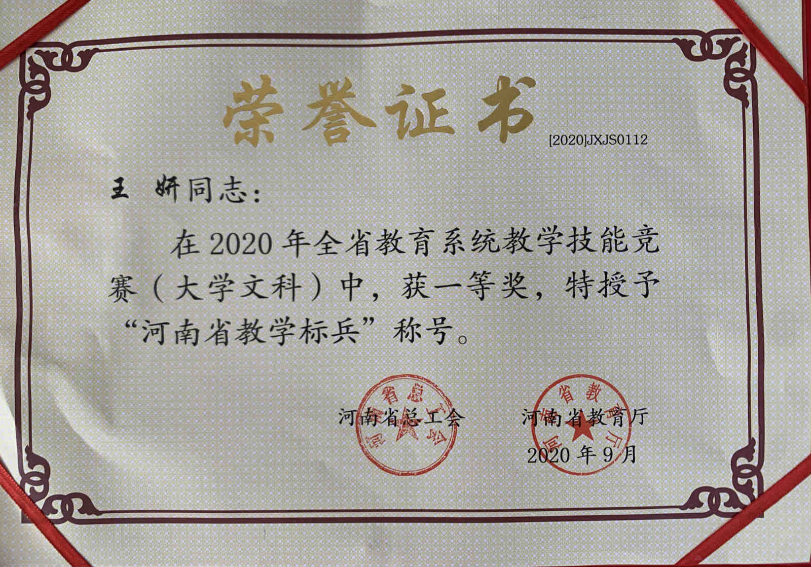 教师王妍从全省100多所院校,1648名参赛选手中脱颖而,荣获大学文科组一等奖,并被授予“河南省教学标兵”荣誉称号和奖章。