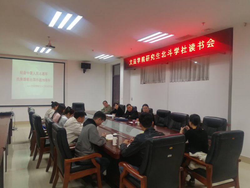 会议室召开纪念抗美援朝出国作战70周年北斗学社读书分享会。院党委副书记余果、院关工委常务副主任杨明亮老师和2020级研究生参与本次活动,活动由研究生班主任朱瑞萍主持。
