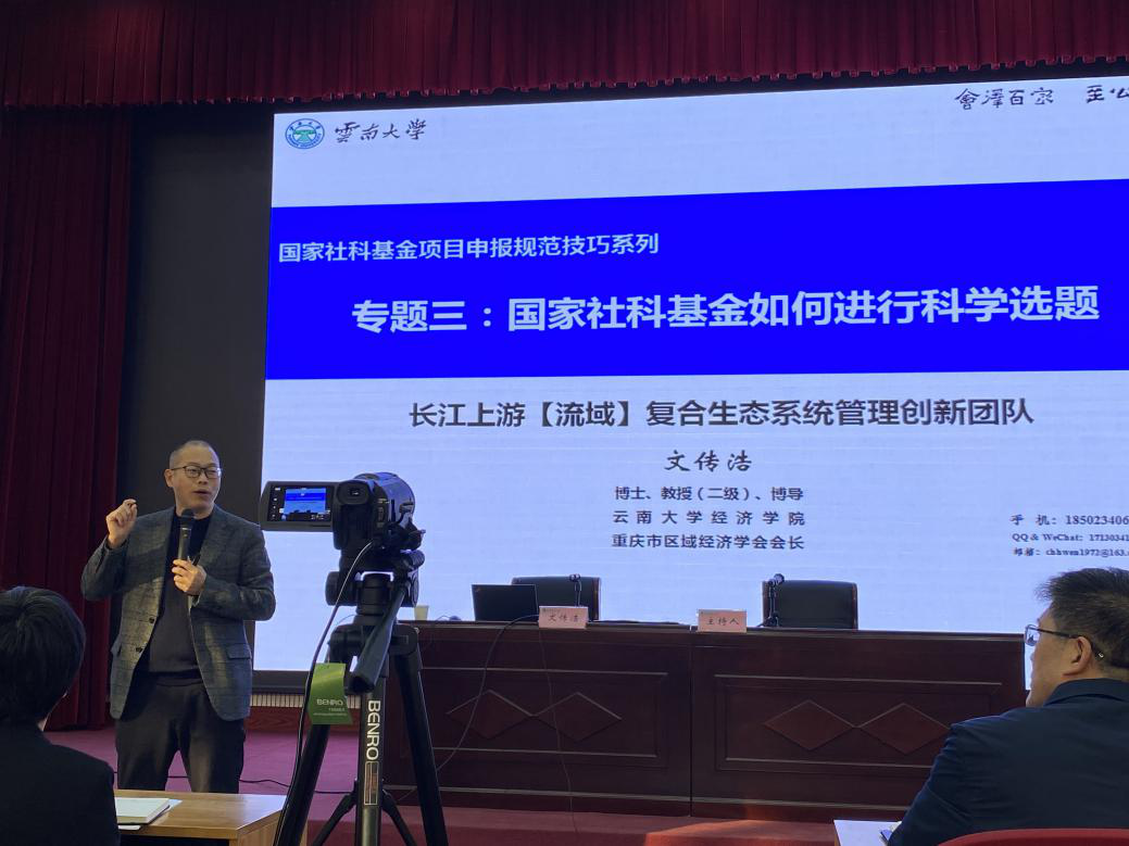 文传浩强调,国家社科基金的选题是生活经验与学术思想结合的产物,是多种思维模式有机结合的产物,需要开阔的视野和独到的角度相结合,来源于生活但是又高于生活;申请人要将研读和思考各级各类文件当做良好的科研习惯来培养,找到国家、社会、地方经济亟待解决的问题与自身的前期科研基础的最佳契合点作为突破口,从而凝练出选题。