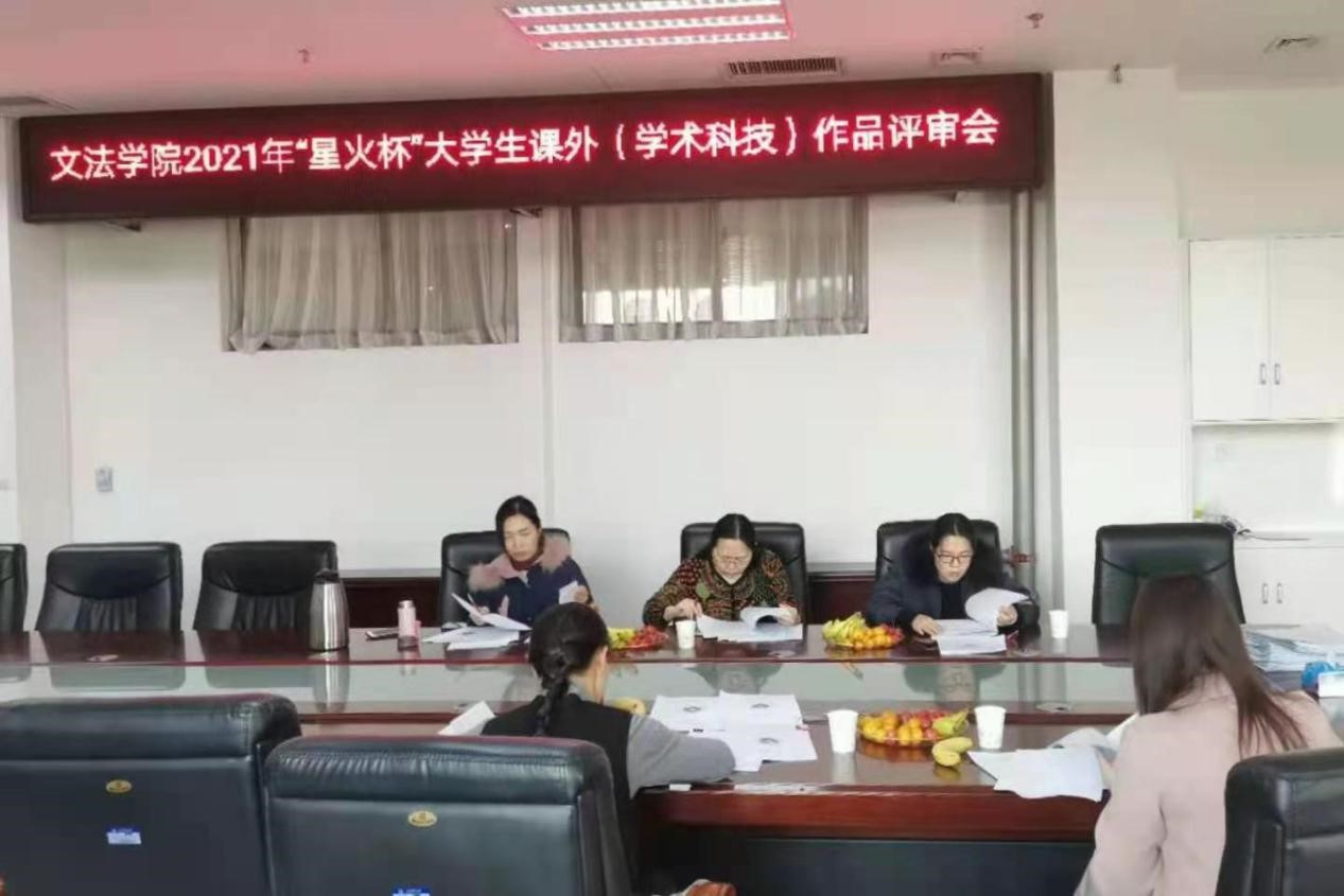 2021年“星火杯”大学生课外(学术科技)作品评审会。法律系徐轶博、行管系贺娜和王妍、中文系吴亮、社会学系宋丽娜等五位老师担任评委,对全院56件作品进行了评审,院党委副书记余果主持评审会。