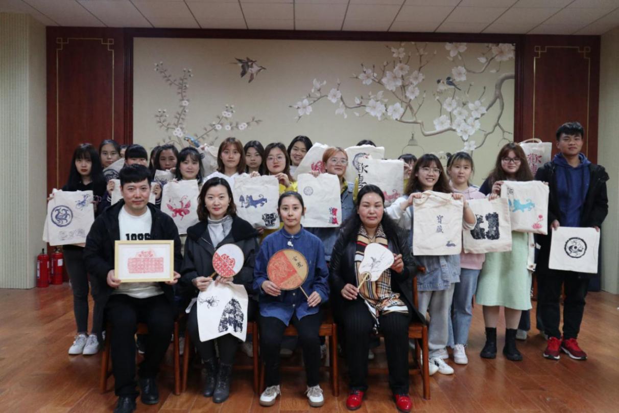 杨慧通过几张图片和细致生动地讲解把“金石传拓”的起源、发展以及载体直观地展现在师生面前,并同师生分享了以前和师父修复石窟的艰辛故事,阐述了传拓技艺与文创产品相结合的意义。在教学过程中,杨慧多次提到,要想使现在的年轻人和身边朋友对“金石传拓”技艺感兴趣,就要使之趣味化、世俗化。杨慧亲自拓片,向师生们耐心讲述具体步骤以及在这过程中应注意的问题,带领师生亲手设计、制作拓片元素挎包。现场气氛十分活跃,师生代表积极参加、动手制作并与杨慧进行交流,各式各样的拓片元素挎包异彩纷呈。
