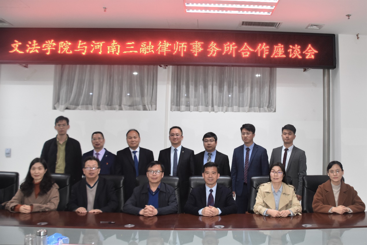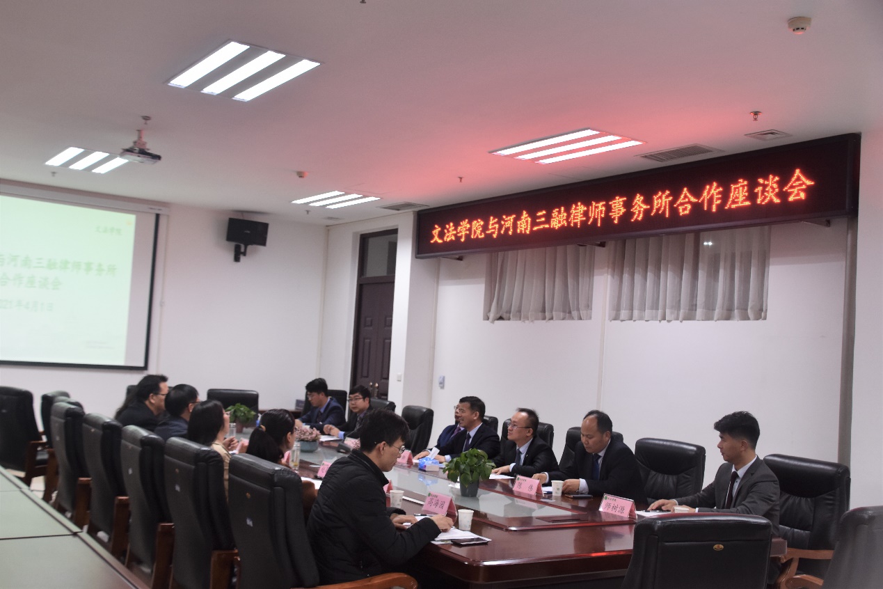 与河南三融律师事务所在教学实际基地和法律研究中心共建方面进行了深入洽谈。院长王晓勇、副院长杨红朝、法律系副主任赵菊敏以及部分法律系教师参加了座谈。
