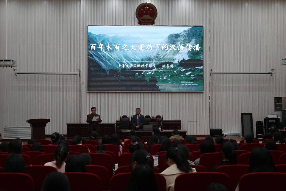 于龙子湖校区模拟法庭举办主题为“百年未有之大变局下的汉语传播”的专题讲座。特别邀请世界汉语教学学会教师发展专业委员会会员、中国高教学会外国留学生教育管理分会常务理事、中国先秦研究会国学双语研究分会常任理事、上海大学国际教育太阳城App