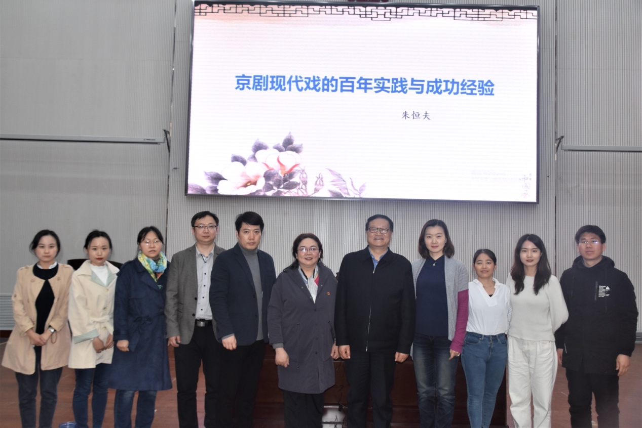 朱恒夫教授首先从现代戏的概念讲起,他认为,真正意义上的现代戏,不仅取材于当代的生活,且要反映时代的精神和社会的趋势,并在此时主流美学思想的指导下作不同于传统剧目的舞台呈现。他讲到,百年历程的京剧现代戏创作一共分为三个阶段,第一阶段起迄于1910年左右到1964年左右,该阶段的特点是被当作政治思想的宣传工具;第二阶段是1964年至1976年,其特点是在演、音、美等方面创造出了系列的新形式,主创者力求艺术地表现革命历史题材故事或社会主义时期的斗争与建设生活;第三阶段是1976年至现在。其特点是取材不限于“政治”“革命”或相关的内容,主人公多为“小人物”,并把着力点放在人物心理的揭示上,努力按照京剧的表演方法创造出新的美的身段动作。他指出,京剧现代戏的成功经验主要有:顶层设计现代戏剧目的创演,以保证题材、剧旨近似的剧目同中有异,避免撞车;用贯穿全剧的主题音乐,来塑造人物的音乐形象;为人物设计个性化的唱腔;用“普白”和“京韵白”来唱念,消除语言上的传播障碍;用中西混合乐队来伴奏;以“百姓”为主人公,讲述百姓故事;将现当代生活的动作按照京剧传统程式的美学原则,创造出新的表演身段。报告内容丰富、深入浅出,与会师生受益匪浅。