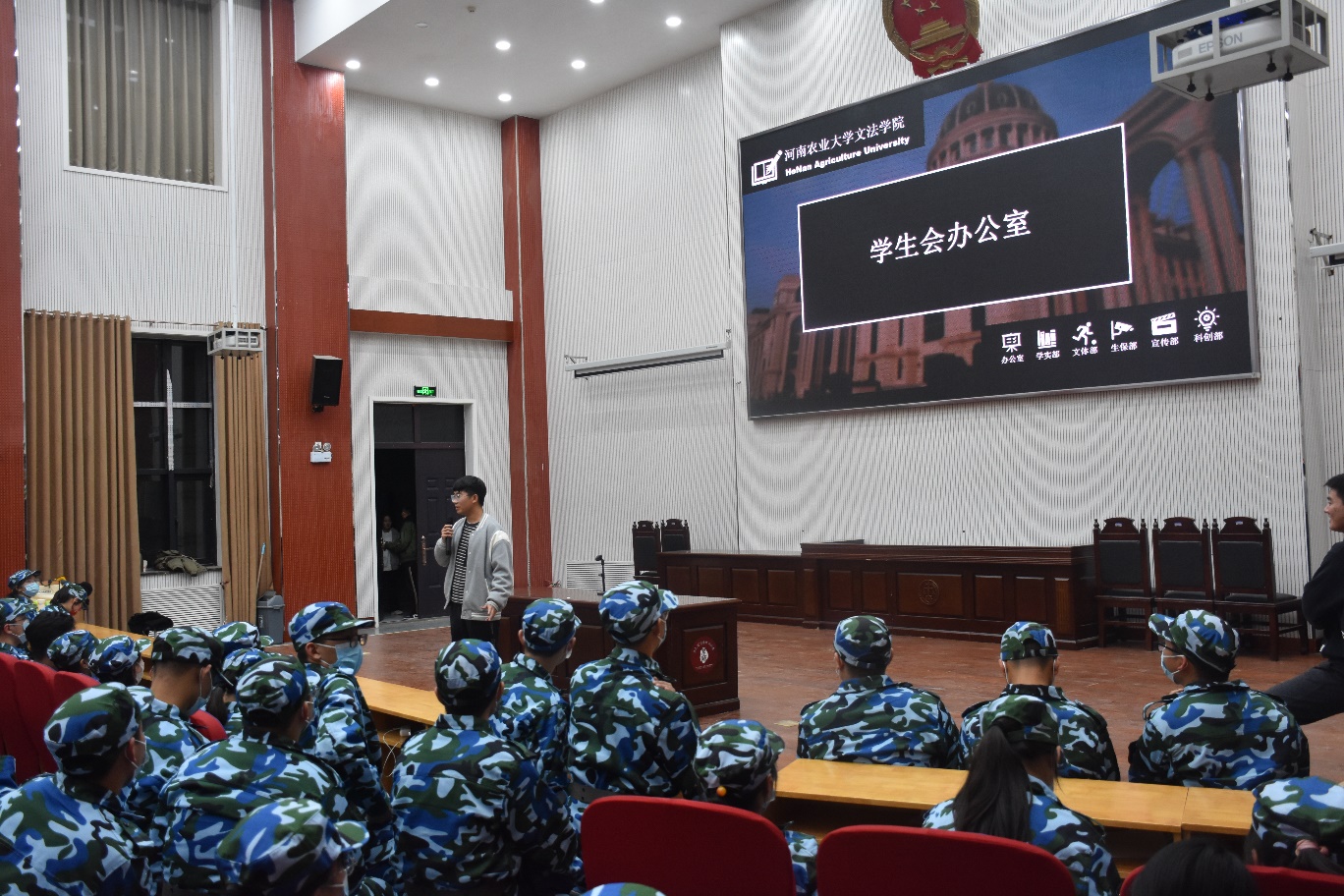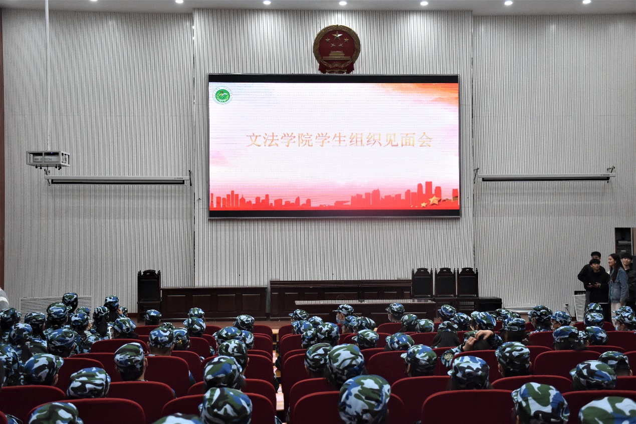 于模拟法庭举行学生组织见面会。21级辅导员赵梦闪、部分学生组织成员及21级全体学生参加见面会。