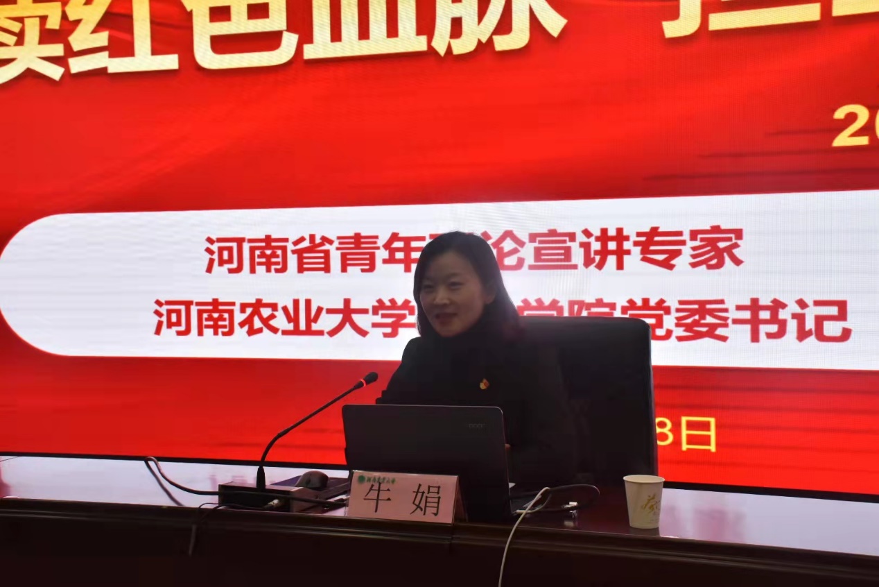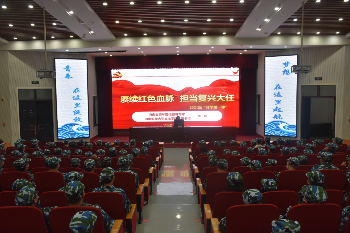 党委书记牛娟在龙子湖校区AB座大教室1以“赓续红色血脉,担当复兴大任”为主题为全体2021级本科生和研究生新生上“开学第一课”。活动由院党委副书记余果主持。
