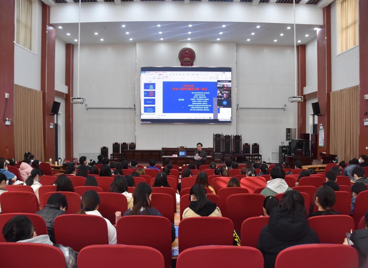 师生作主题为“新时代的《中华人民共和国民法典》”的学术报告。院长王晓勇、政策法规办公室副主任张帅梁、副院长杨红朝以及部分师生代表参加了报告。会议由王晓勇主持。