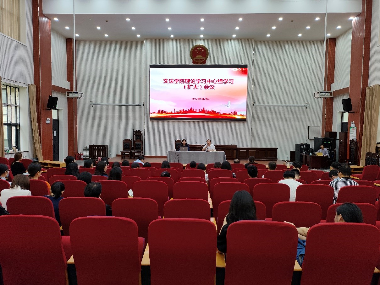 于龙子湖校区模拟法庭召开党委理论中心组学习(扩大)会议,全体教职工参会。会议由院长王晓勇主持。
