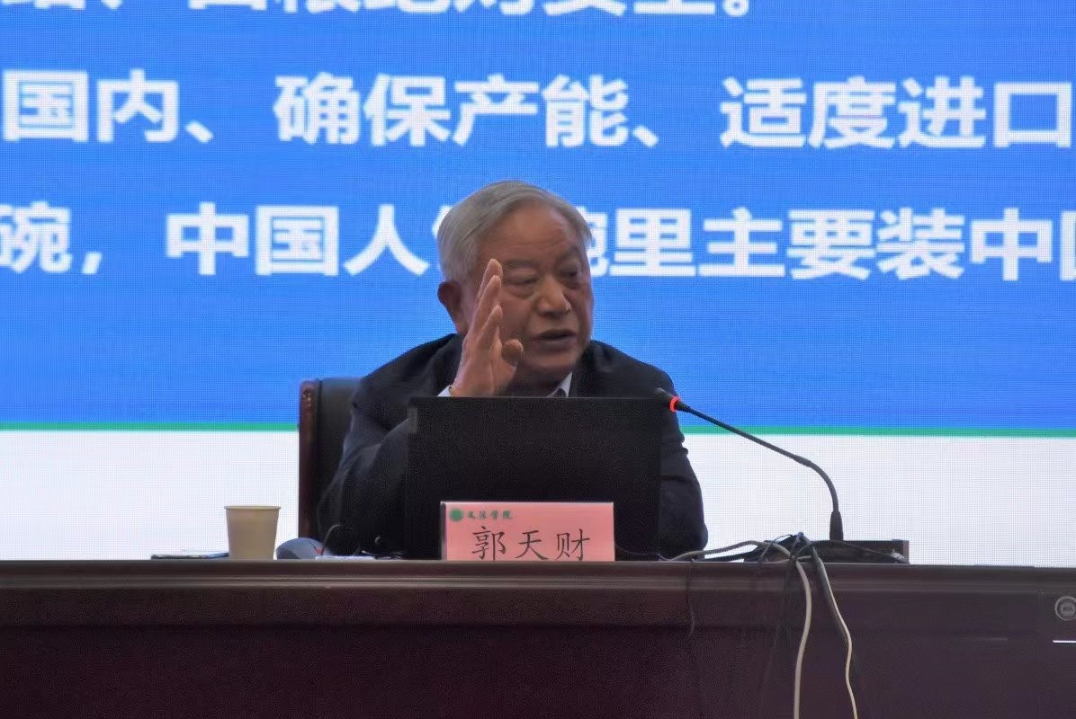 郭天财以粮食生产与国家安全为主题作报告。他从粮食安全的极端重要性、新发展阶段我国粮食安全存在的主要问题、粮食生产发展对策三个层次入手,深入细致的讲述了粮食是国家战略物资和武器,粮食安全是国家安全的重要基础。他提出,我们应牢固树立粮食安全观,不断深入解决我国粮食安全所面临的各种问题,推动我国从农业大国向农业强国迈进。