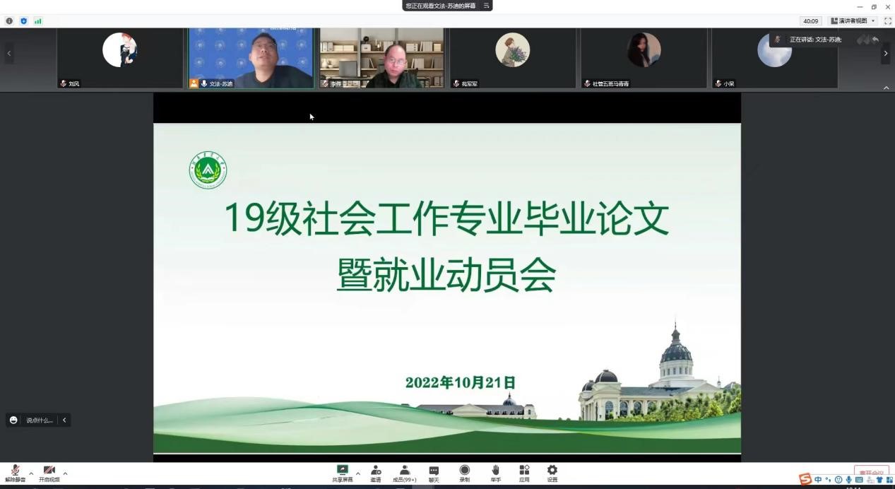 通过线上方式举行2019级社会工作专业毕业论文暨就业动员会,社会学系教师、龙子湖校区社会工作专业和许昌校区社管专业全体学生参加会议。会议由社会学系主任刘风主持。