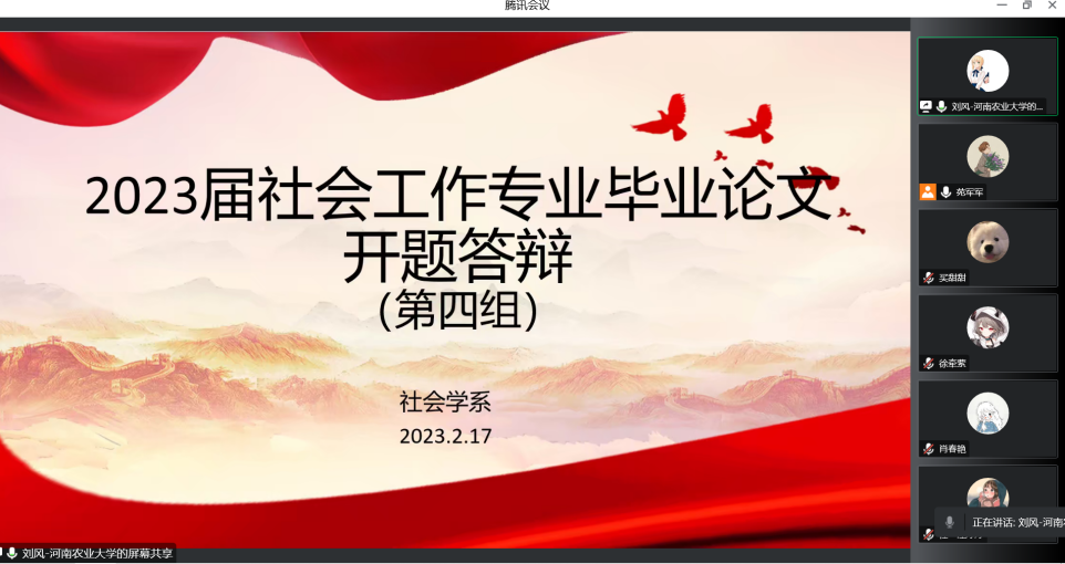 本科毕业论文工作安排,社会学系组织2023届社会工作专业本科生进行毕业论文开题答辩。参加开题答辩的有84名2023届社会工作专业本科生和17位本科毕业论文指导老师,共分为五个答辩组,每个答辩组3-4位指导老师,采用线上方式进行。