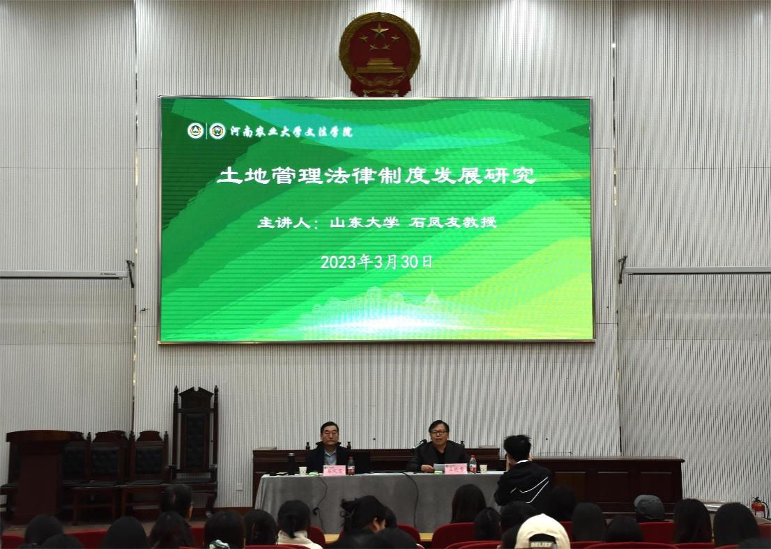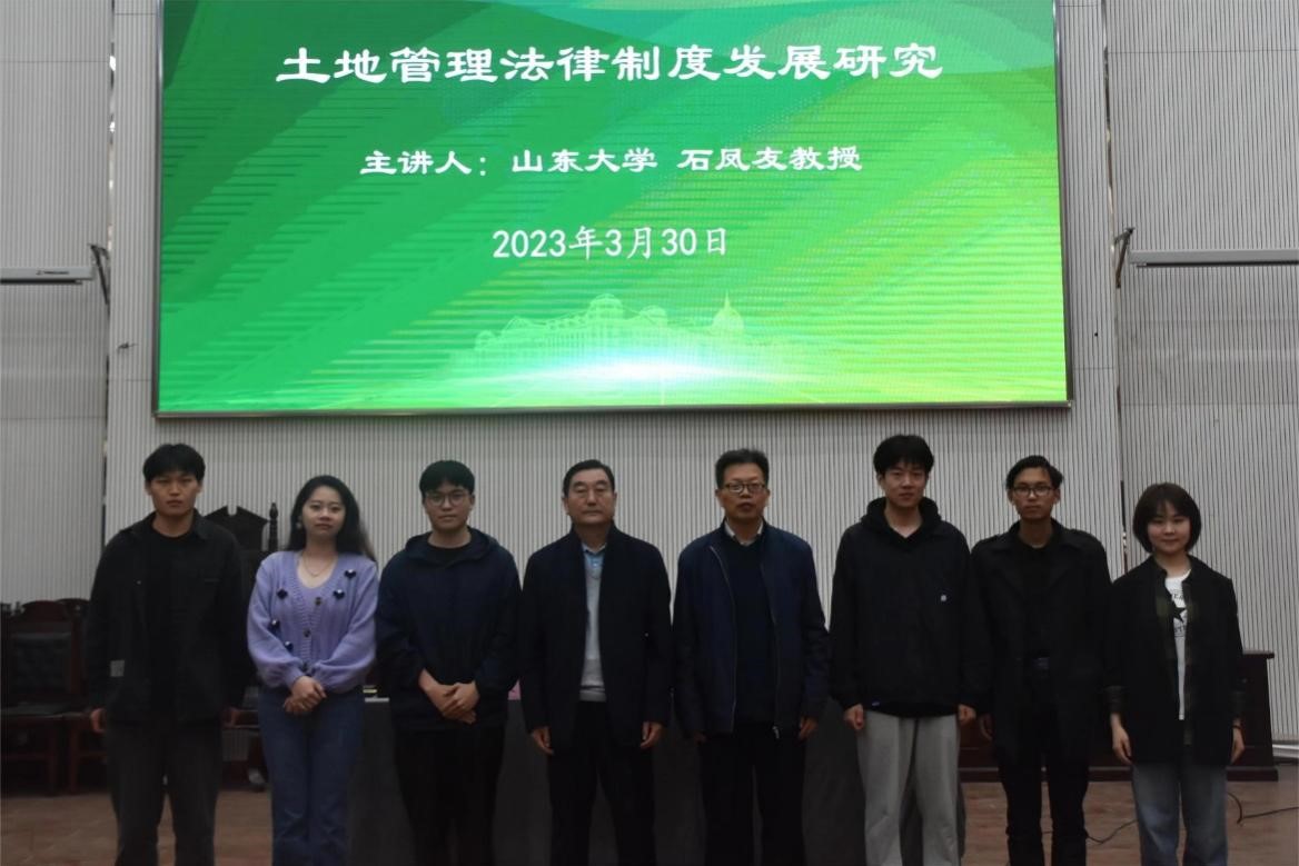 石凤友教授为师生作“土地管理法律制度发展研究”主题报告会。院长王晓勇,副院长杨红朝以及法律系师生代表参加会议。会议由王晓勇主持。会议伊始,王晓勇对石凤友的到来表示感谢和欢迎,并介绍了石凤友学术成就。