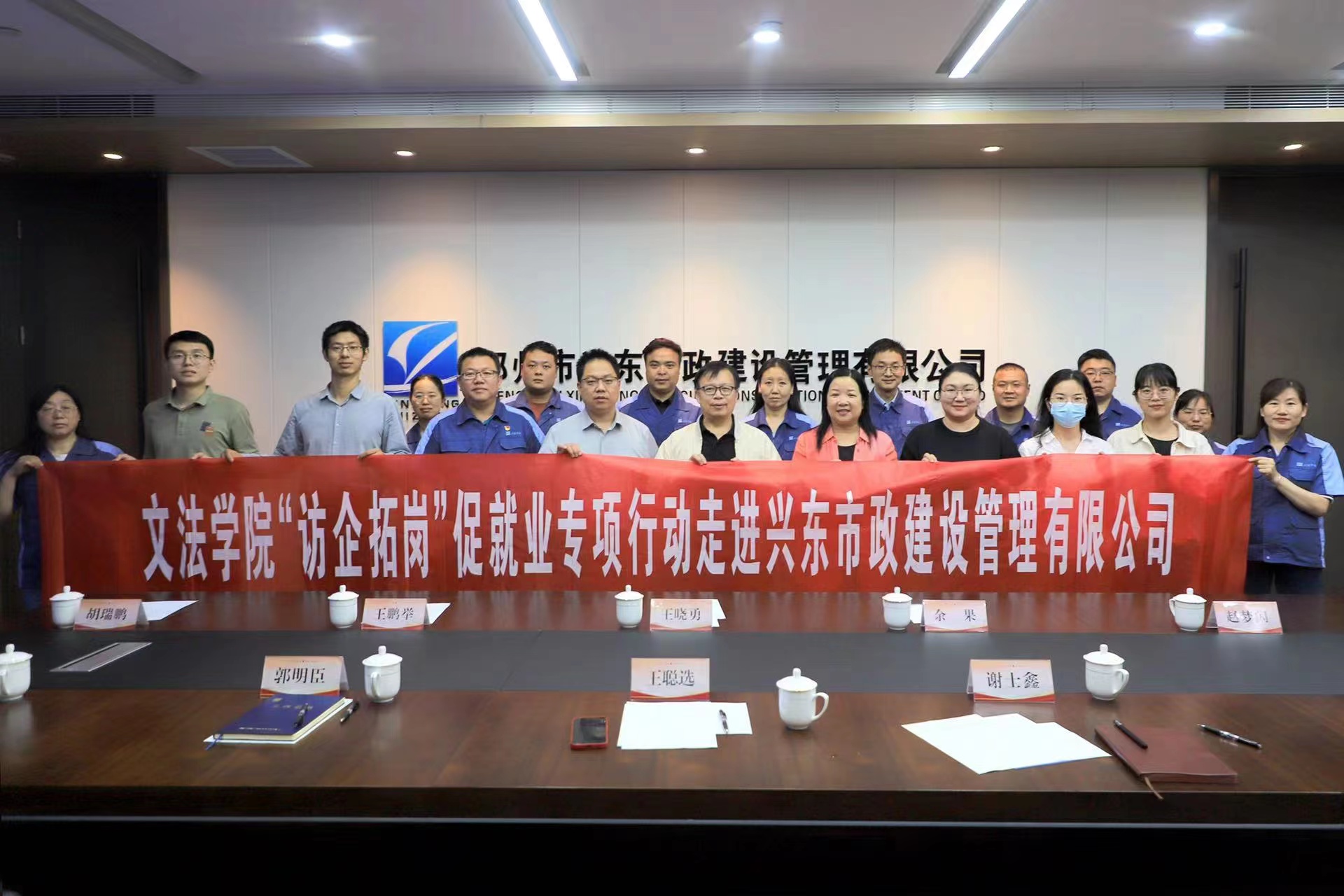 为拓展毕业生就业渠道,加快实现毕业生顺利就业,5月26日,院长王晓勇、党委副书记余果、团委书记王鹏举、团委副书记赵梦闪等一行人前往郑州市兴东市政建设管理有限公司开展“访企拓岗”促就业专项行动。兴东市政党支部书记王聪选、党支部副书记兼总经理谢士鑫、党支部委员兼副总经理郭明臣、财务总监王爱玲、工会主席刘瑞、综合办主任刘超鹏以及太阳城App