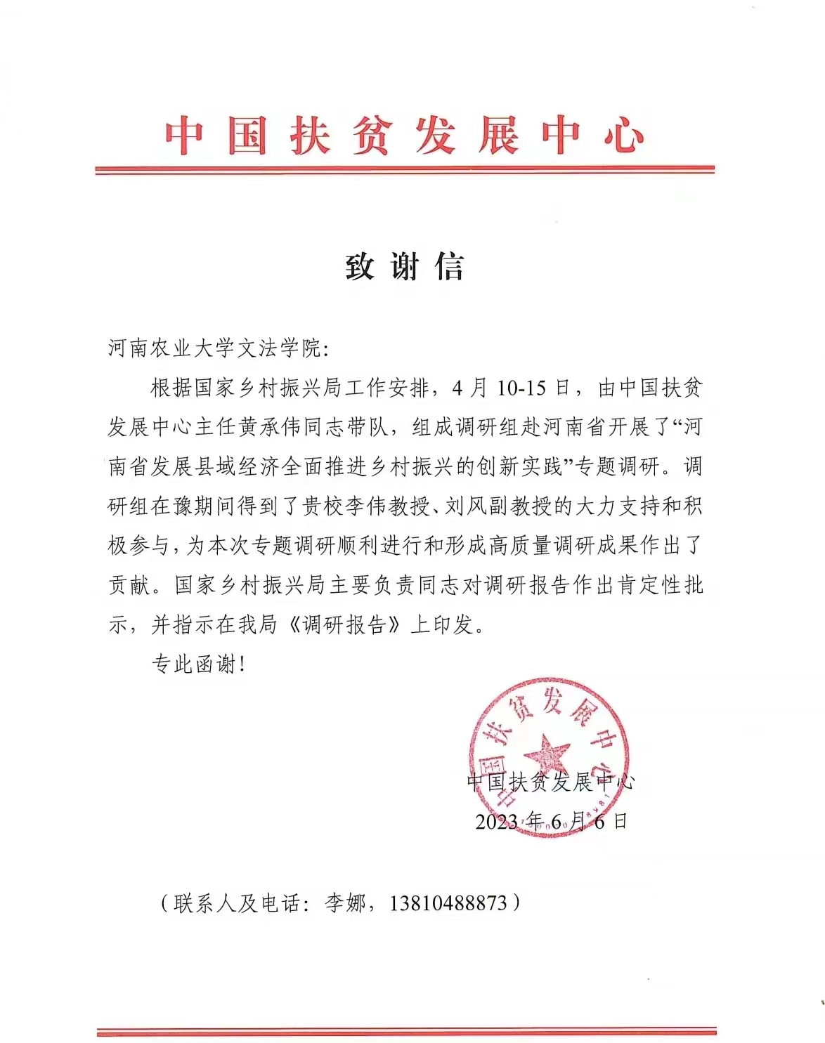 本次调研形成的最终成果得到了国家乡村振兴局主要负责同志的肯定性批示,并在国家乡村振兴局内部刊物《调研报告》上印发。基于调研组在豫期间,李伟、刘风两位同志为调研工作的顺利进行和形成高质量调研成果作出的贡献,中国扶贫发展中心向两位老师发来致谢信。本次调研是太阳城App 人文社科教师服务乡村振兴的一次具体行动,未来,他们将会充分发挥其专业和学科优势,与太阳城App 同频共振,助力河南乡村振兴事业发展。