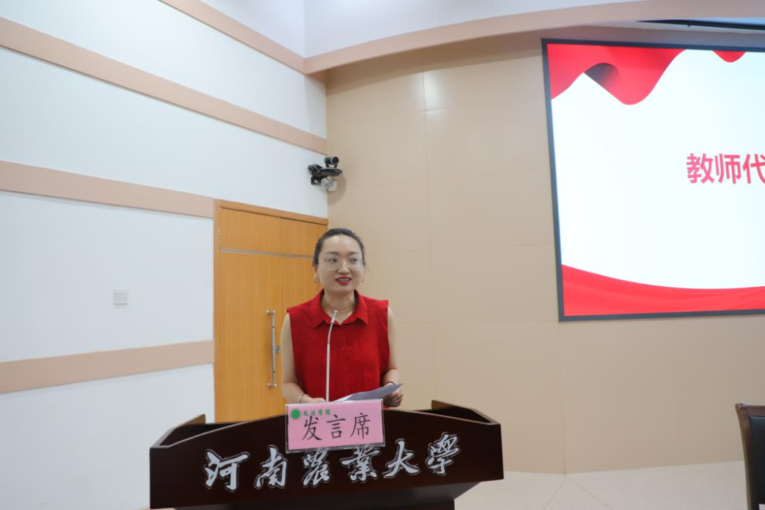 教师代表汉语言文学系代宗艳老师结合自身的经历同新生分享经验,希望同学们学会做人、学会做事、学会生活,勉励新生树立远大的理想,做好面对困难的心理准备,不惧艰苦,享受美好的大学生活。
