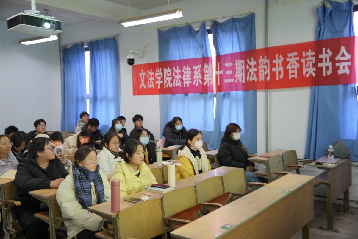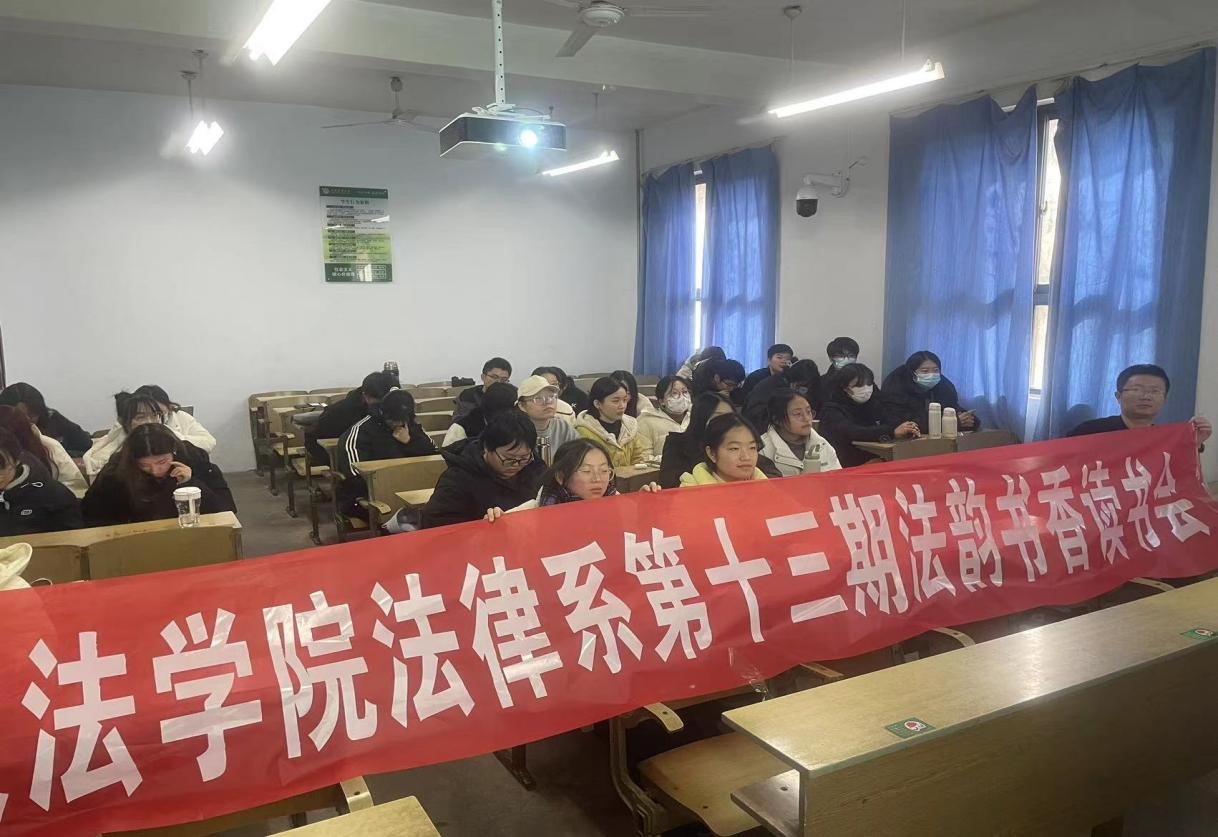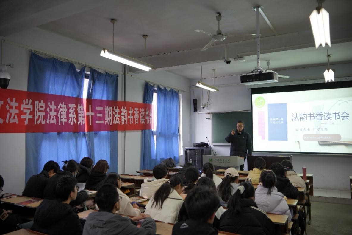 法律系第十三期法韵书香读书会在文化路校区三号教学楼214教室举办。法律系教师袁昊及23级法学二班学生参加读书会,活动由法律系主任韩宁主持。