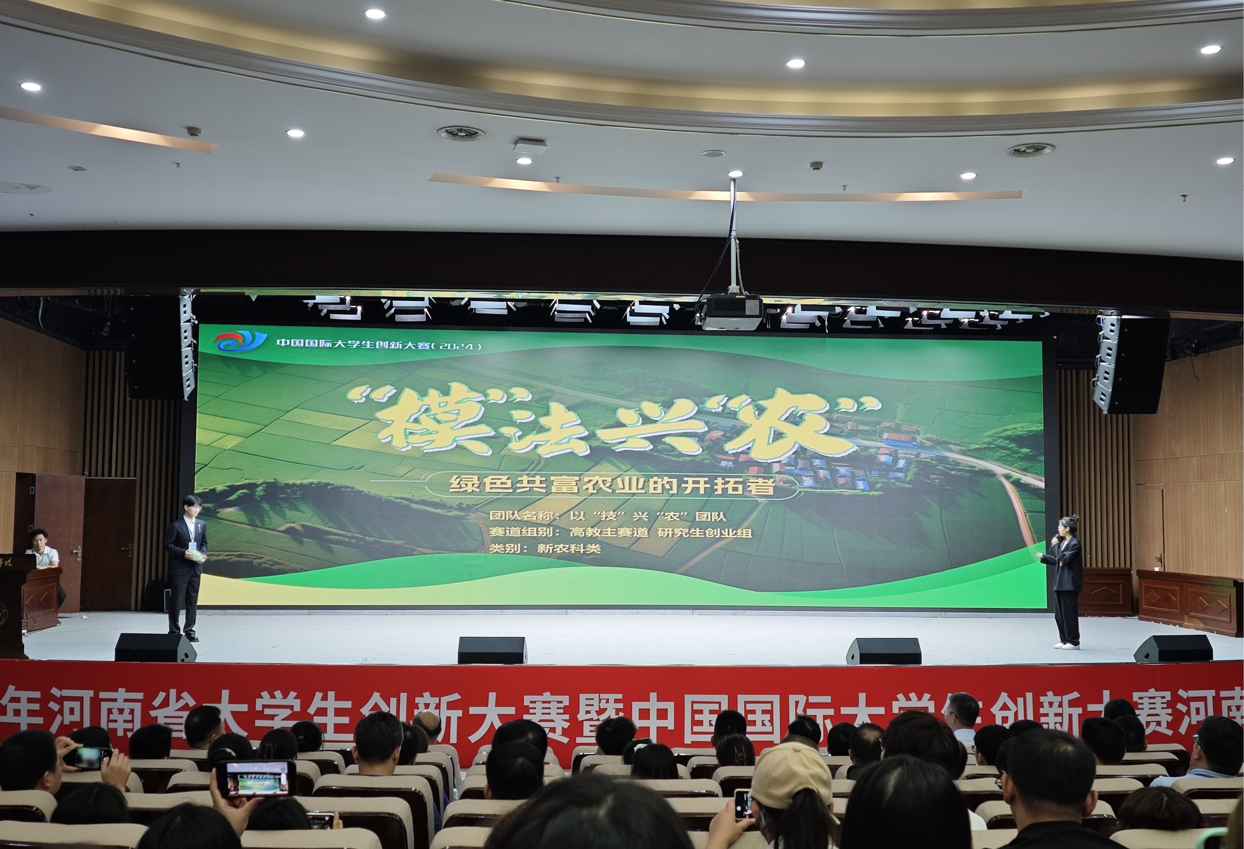 农业管理研究生李沐阳、宋科辰、李珂等主持的项目《“模”法兴“农”——绿色共富农业的开拓者》获得河南省高教主赛道研究生创业组第一名,同时成功入围冠军争夺赛的现场。