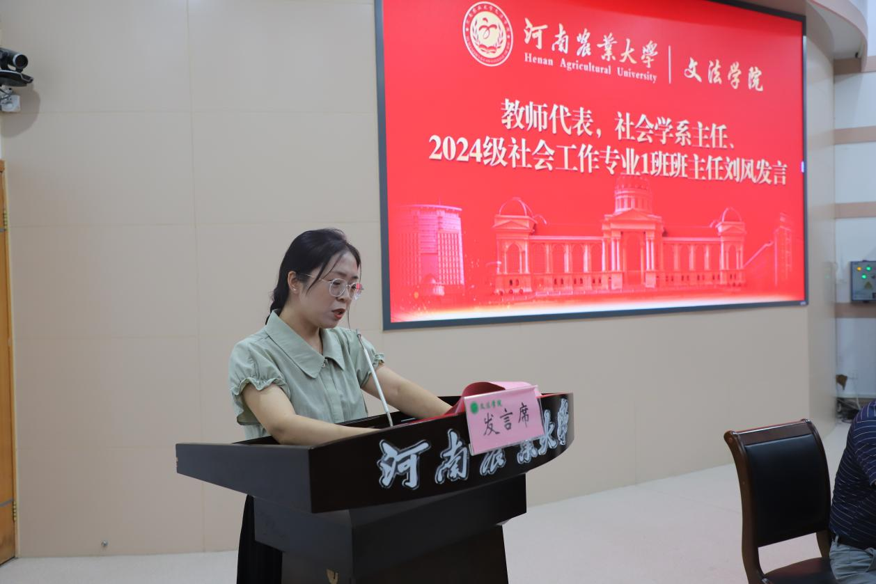 教师代表社会学系主任、2024级社会工作专业1班班主任刘风老师寄语新生,希望与24级同学们携手共进、共同进步,鼓励新生在追求学业的同时提升品德修养,发扬团结友爱、吃苦耐劳的集体精神。