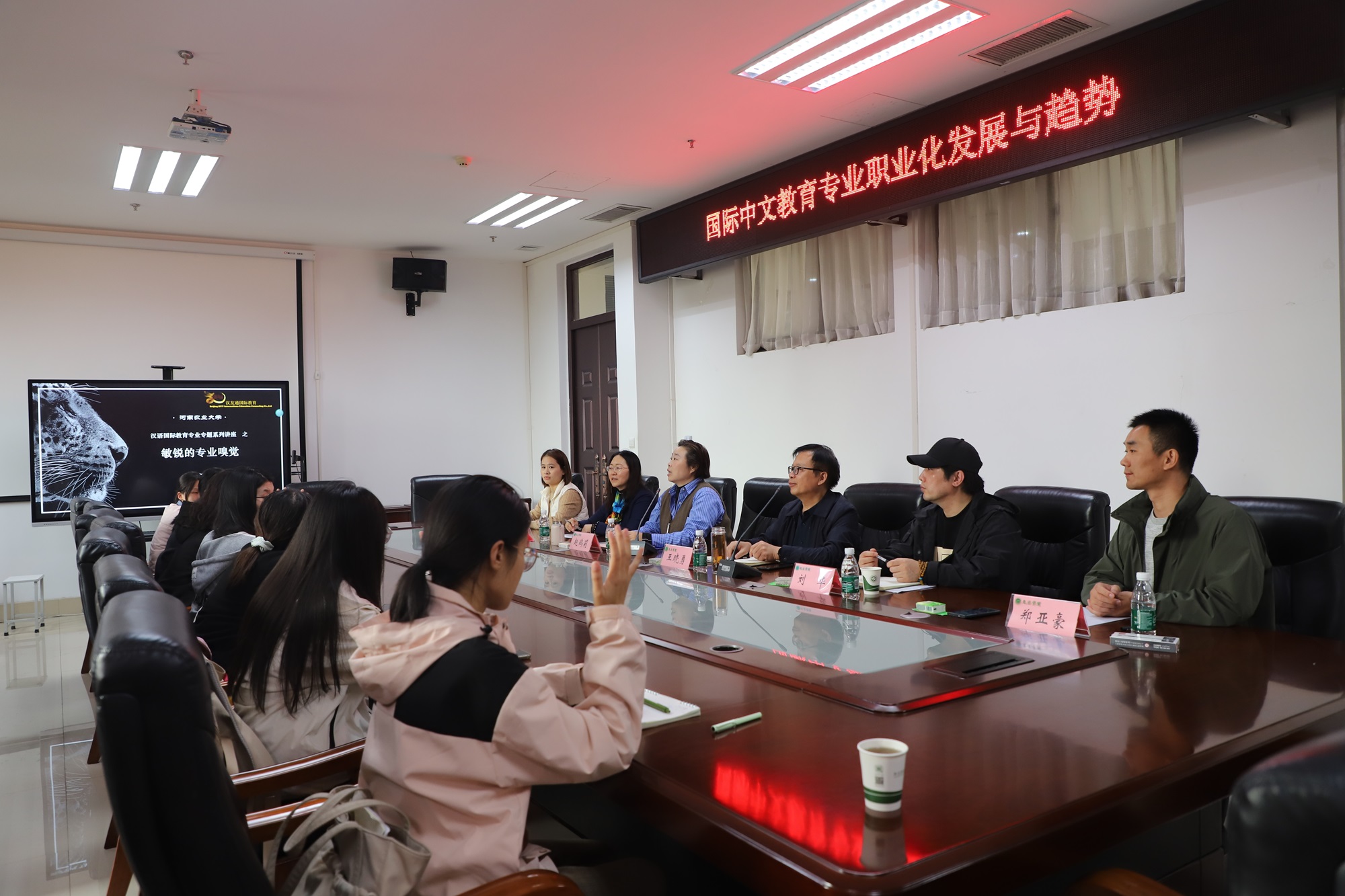 师生带来了一场题为“国际中文教育专业职业化发展与趋势”的专题讲座。此次讲座由院长王晓勇主持,汉语言文学系主任刘华,副主任、学科负责人吴亮以及汉语系教师代表参加,讲座吸引了众多汉语国际教育专业本科生和国际中文教育硕士生前来聆听。