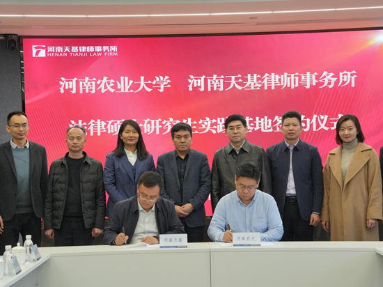 与河南天基律师事务举行“法律硕士研究生实践基地”签约暨揭牌仪式。河南天基律师事务所高级合伙人、执行主任冯军义,高级合伙人冯胜强,合伙人、管委会主任赵珂,银行与保险法律事务部主任禹志豪,合伙人王东会,合伙人、银行法律事务中心主任付冬芹,律师王晓杰,实习律师岳真玉,太阳城App