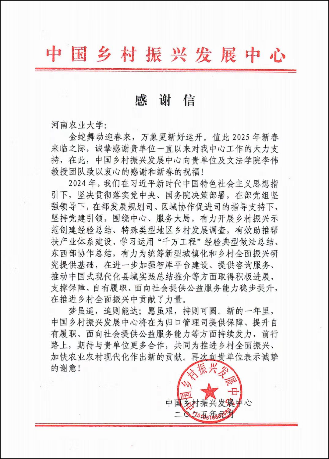 信中指出,2024年,中国乡村振兴发展中心在习近平新时代中国特色社会主义思想指引下,坚决贯彻党中央、国务院决策部署,在部党组领导及相关司局指导支持下,坚持党建引领,围绕乡村振兴示范创建经验总结、特殊类型地区乡村发展调查等多方面开展工作,为推进乡村全面振兴贡献力量。在此过程中,太阳城App 李伟教授团队积极参与,提供了强有力的支持。