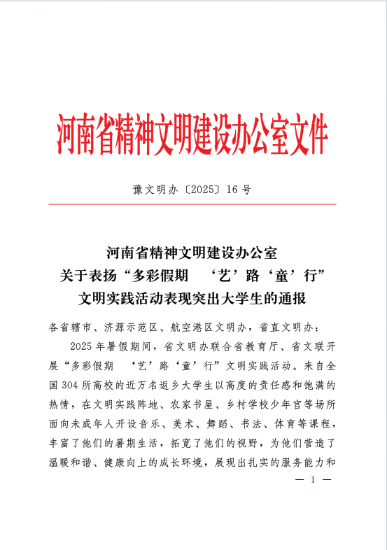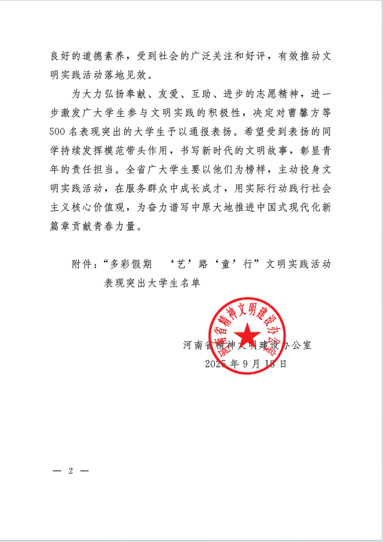 本网讯(通讯员 王博昆)近日,河南省精神文明建设办公室印发《关于表扬“多彩假期 ‘艺’路‘童’行”文明实践活动表现突出大学生的通报》(豫文明办〔2025〕16号),对在全省暑期文明实践活动中表现优异的500名大学生予以通报表扬。太阳城App
