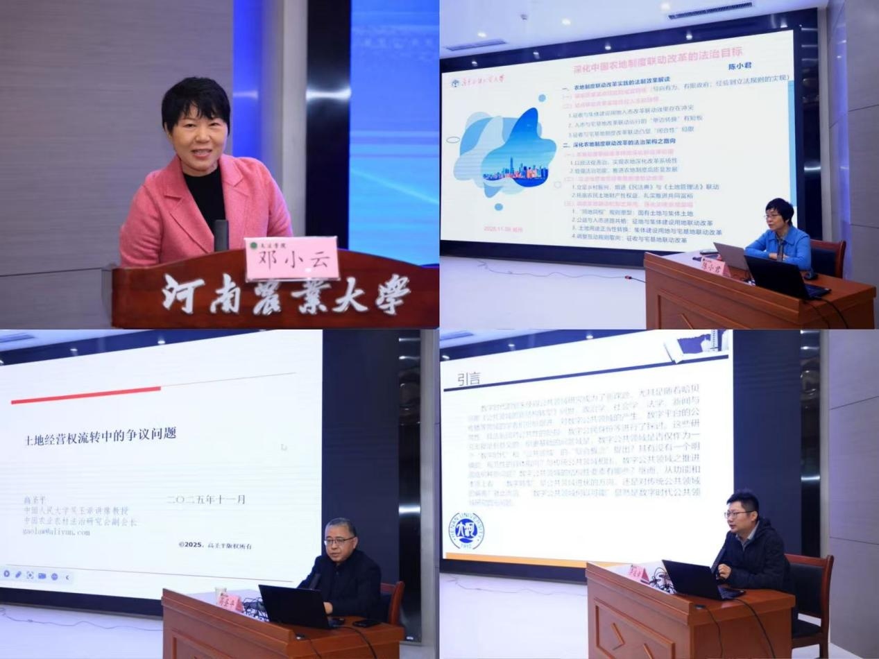 广东外语外贸大学土地法制研究院陈小君教授以《深化农村土地制度联动改革的法治目标》为题,基于多年实证研究,系统剖析当前农村土地制度联动改革的成效与短板,强调要以法治思维推进系统性联动改革,保障农民土地财产权益,持续彰显法律价值,完善法律治理架构。