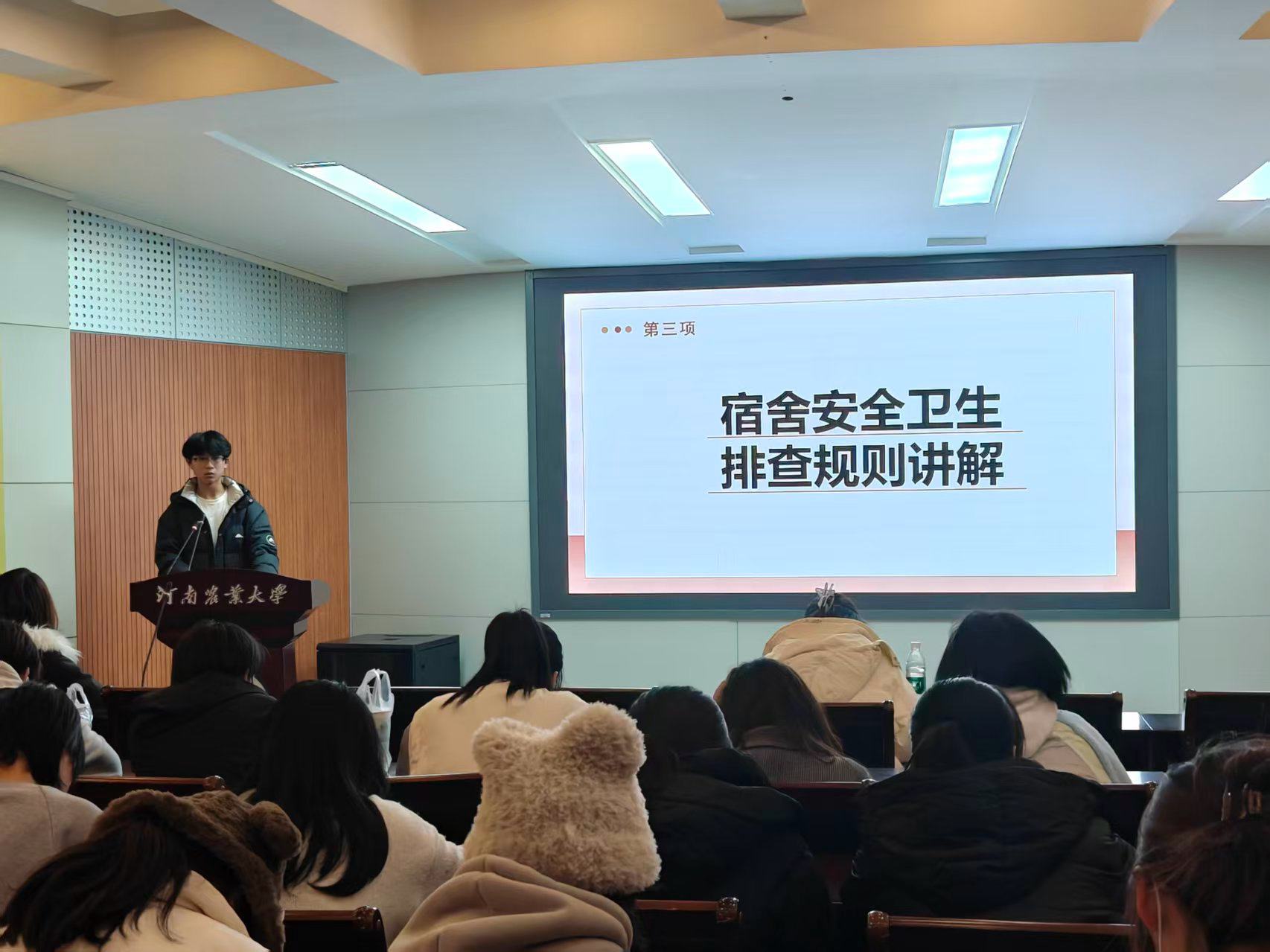生保部志愿者张硕围绕宿舍安全卫生工作的重点,详细讲解隐患排查细则,明确安全隐患排查重点和卫生标准,进一步增强寝室长的责任意识,提升其管理能力。