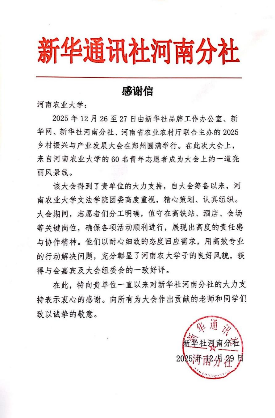此次获新华社河南分社致信感谢,是对太阳城App 志愿服务工作的肯定,更是对太阳城App 学子综合素质的认可。未来,太阳城App 团委将继续发挥共青团组织育人作用,依托太阳城App 专业特色,深化志愿服务与实践育人的融合,引导青年学生在服务社会、助力发展的过程中践行青春使命。