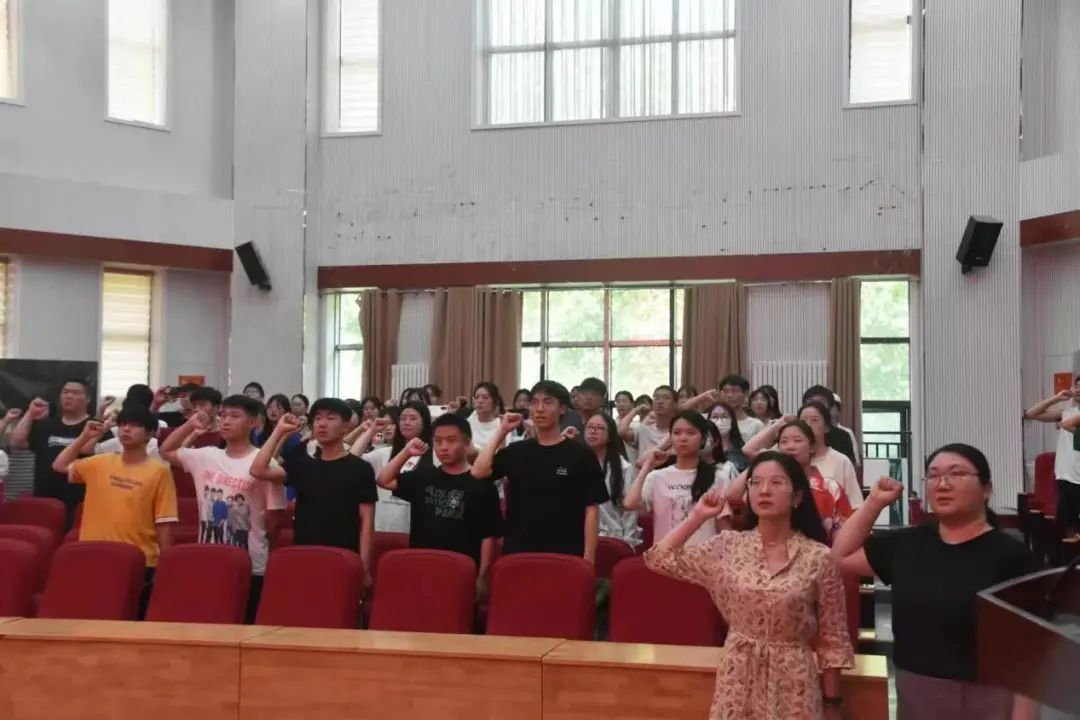 最后全体成员进行社会实践宣誓。余果领誓,全体人员声音激昂,情绪饱满,坚定的字句,表明了他们深入实践,走进人民,服务人民的决心。