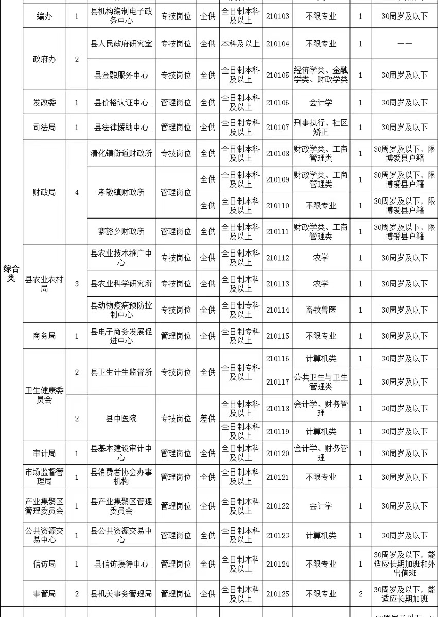 8.定向招聘岗位,岗位代码210104为定向招聘岗位,报考定向招聘岗位的,须是参加国家志愿服务西部计划和我省志愿服务贫困县计划服务期满且考核合格且未进入公务员、事业编制的博爱籍毕业生(提供户口本和证书原件及复印件);下派到博爱县服务或博爱籍的服务期满考核合格且未进入公务员、事业编制的“三支一扶”大学生(提供户口本和证书原件及复印件);参加焦作市“大学生村干部”计划在博爱县农村连续任职满一个聘期考核合格且未进入公务员、事业编制的大学生(提供博爱县大学生村干部管理工作领导小组办公室出具的服务期限和考核结果证明);参加“博爱县高校毕业生进社区服务”计划服务期满考核合格且未进入公务员、事业编制的大学生(提供证书原件及复印件);博爱籍退役大学生士兵且未进入公务员、事业编制的(提供户口本、入伍通知书、退伍证和毕业证原件及复印件)和参加河南省高校毕业生政府购岗计划服务期满考核合格且未进入公务员、事业编制的博爱籍大学生(提供户口本和证书原件及复印件);