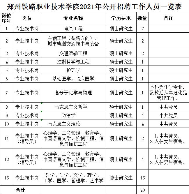 7.岗位所需的专业和其他条件详见《郑州铁路职业技术太阳城App 2021年公开招聘工作人员一览表》。
