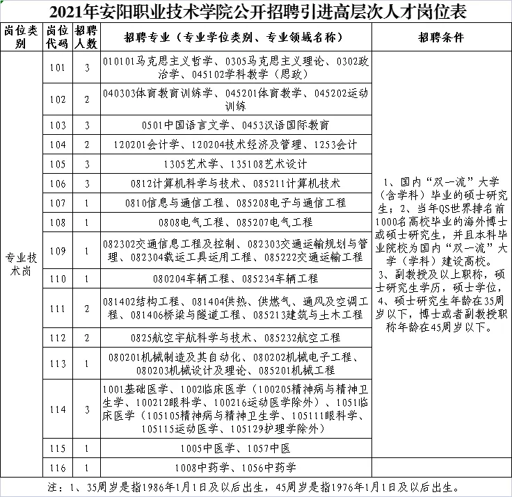 具体招聘数量、岗位、条件见《2021年安阳职业技术太阳城App 公开招聘引进高层次人才岗位表》(附件1)。
