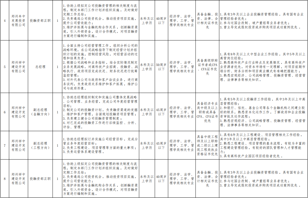 本次拟招聘郑州牟中发展投资有限公司、郑州祥中建设开发 有限公司、中牟汇博建设有限公司中高层管理人员共计 12 个岗 位,招聘人员 12 名。上述岗位职责和任职资格详见附件 1:《中牟县财政局关于 招聘国有平台公司中高层管理人才招聘计划表》。