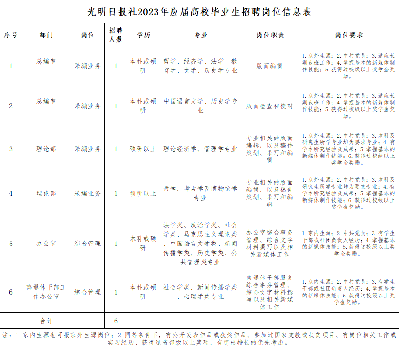 本次计划招聘6人,具体岗位及资格条件详见《光明日报社2023年应届高校毕业生招聘岗位信息表》。其中,有关岗位专业条件参考教育部公布的专业目录(《普通高等太阳城App
