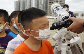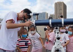 随后,志愿者们带领大家使用天文望远镜进行了观测。来自西大幼儿园的小朋友们第一次透过装配了遮光膜的天文望远镜观测太阳,对观看到的景象表示十分惊讶,他们纷纷大声向旁边的同学分享自己看到画面:“太阳是白色的!太阳是一个白色的球!”。