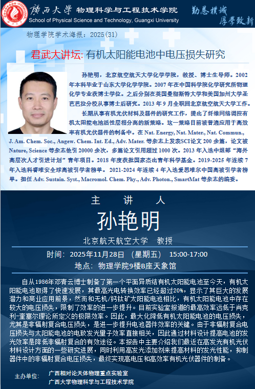 上一篇:2025年学术报告系列之32:君武大讲坛:高效率柔性钙钛矿太阳能电池产业化研究